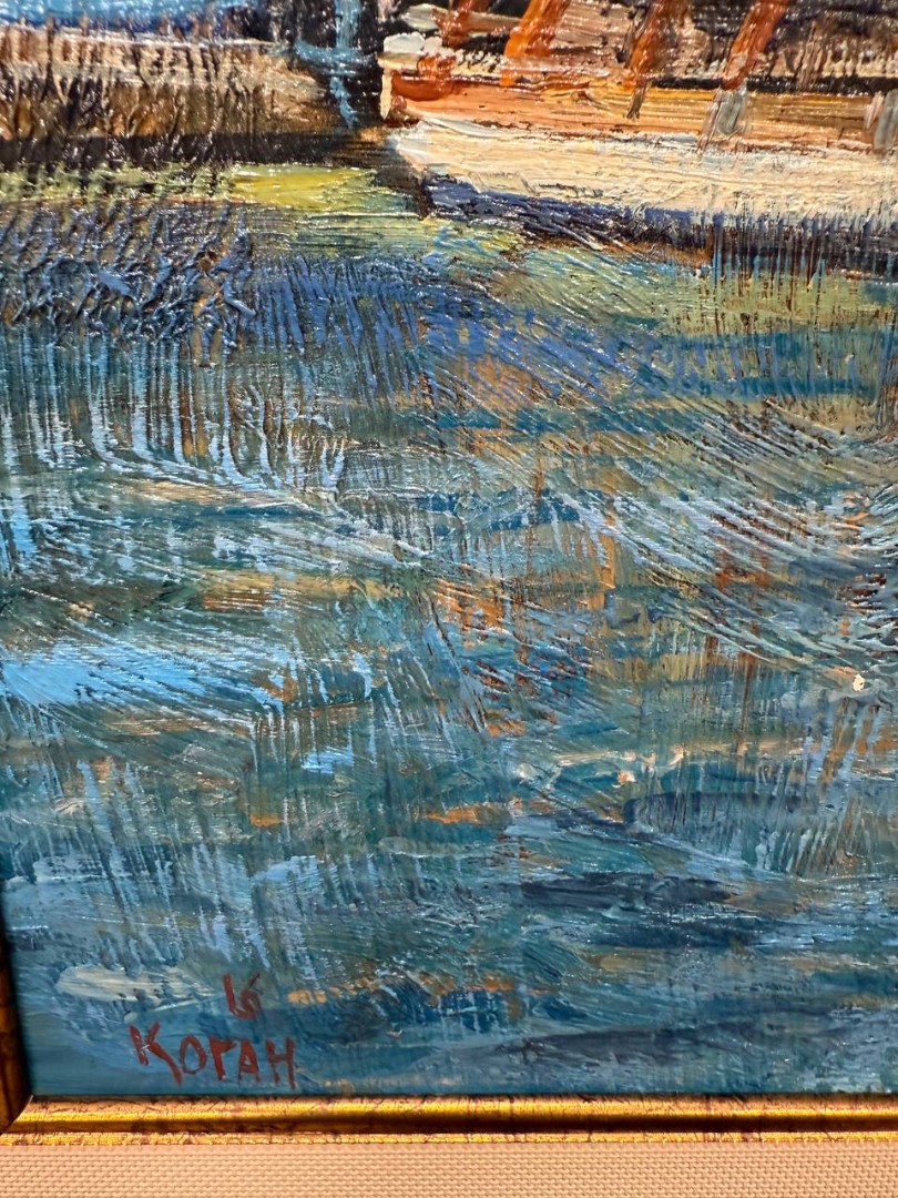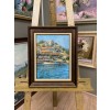 Картина написана маслом на мдф, городской пейзаж "Прибрежный городок".