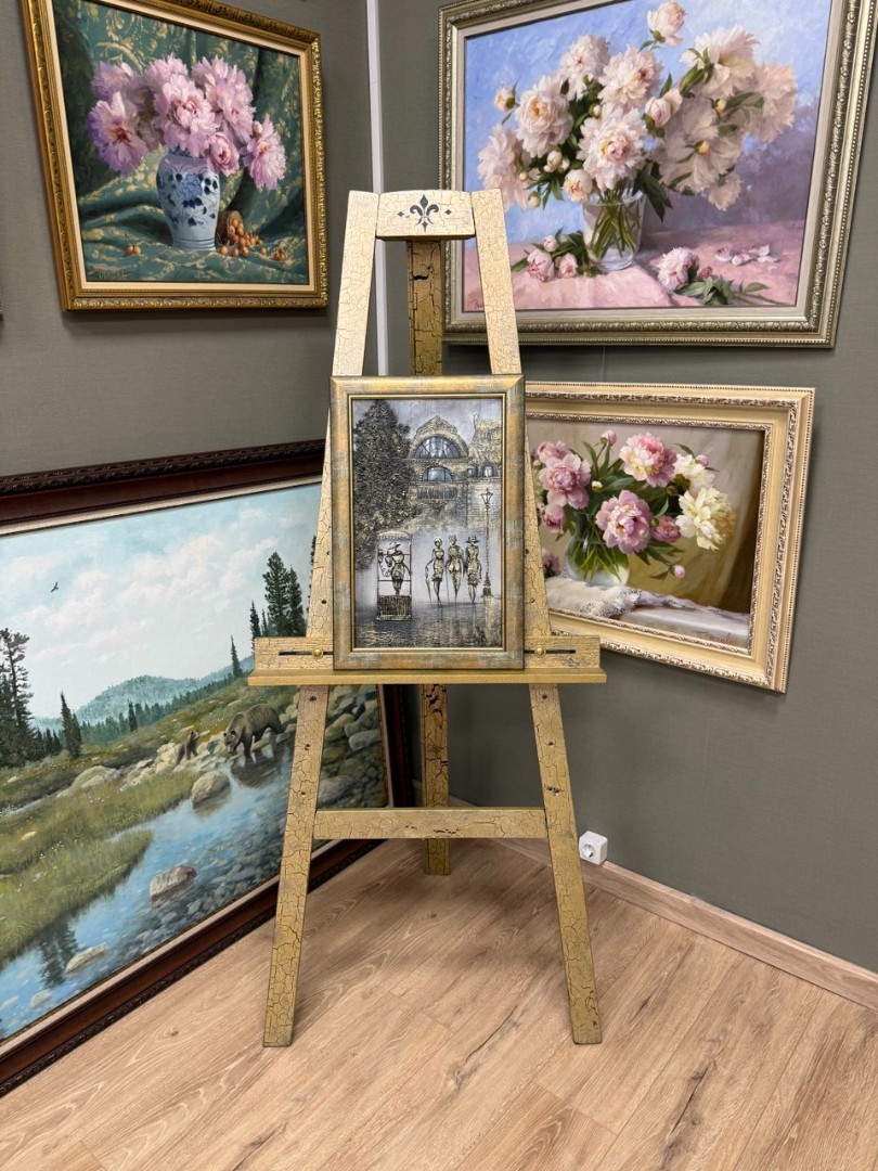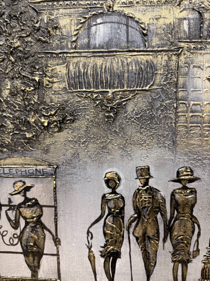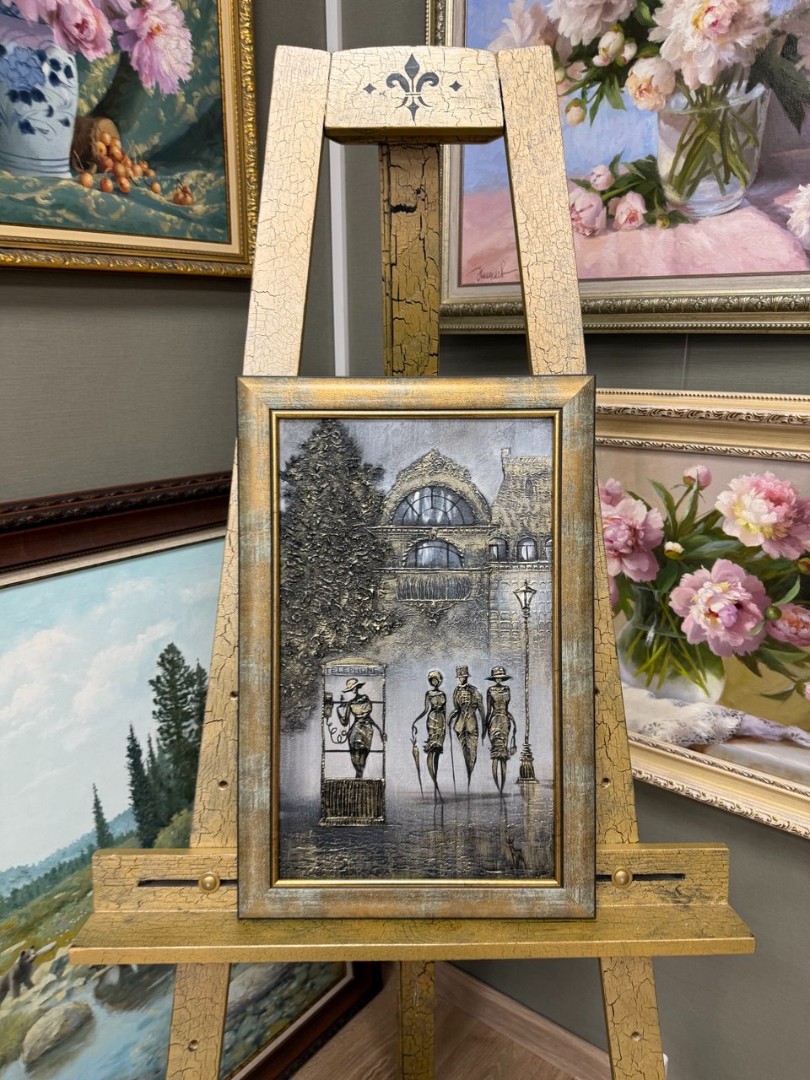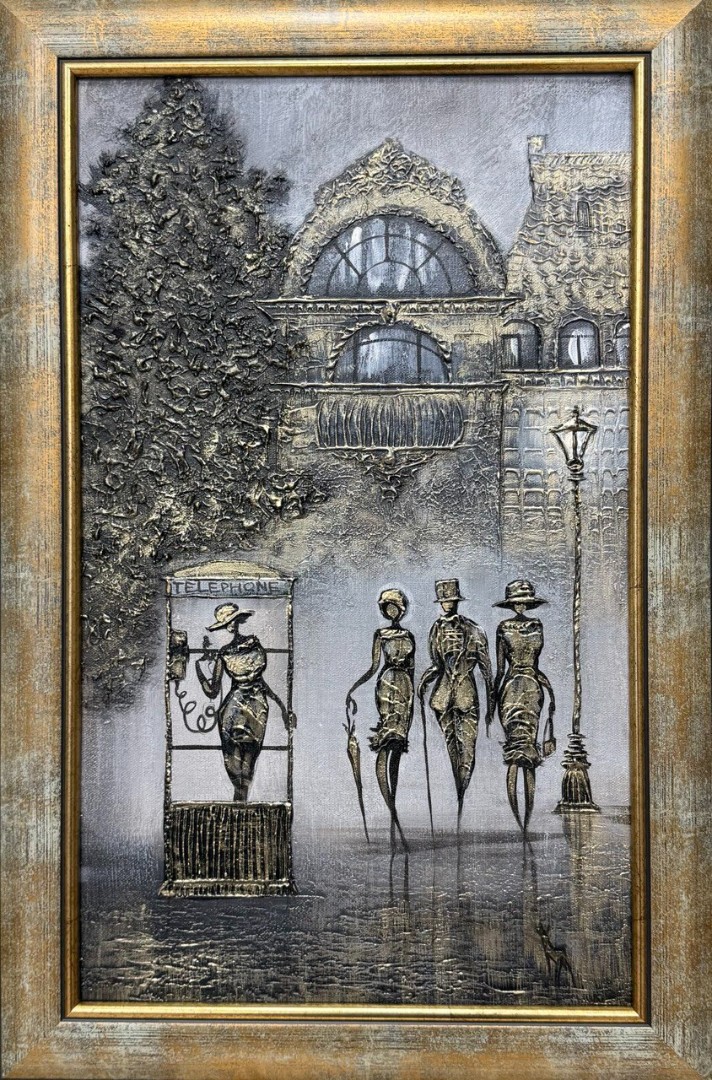Золотые акценты в работе добавляют роскоши, обрисовывая контуры зонтов и деталей одежды персонажей, подчеркивая их утонченность и стиль. Золотистый цвет, словно солнечный луч, проникающий в эту серую городскую жизнь, делает картину особенно живой и запоминающейся. В целом, композиция наполняет зрителя чувством легкости и романтики, присущей прогулкам по городскому пейзажу.
