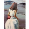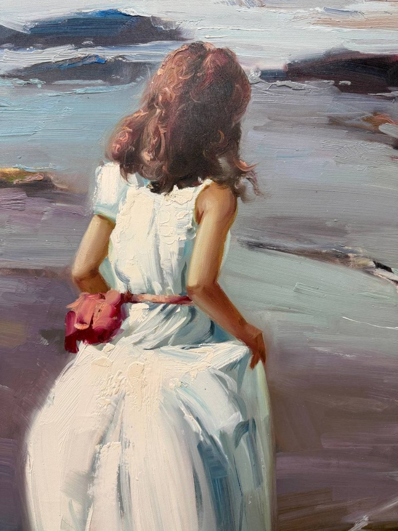 На картине изображена девушка в белом платье с красным поясом. Её распущенные волосы развеваются на ветру. Она идёт по пляжу босиком, наслаждаясь прогулкой.