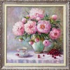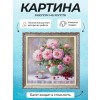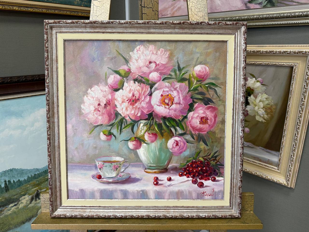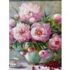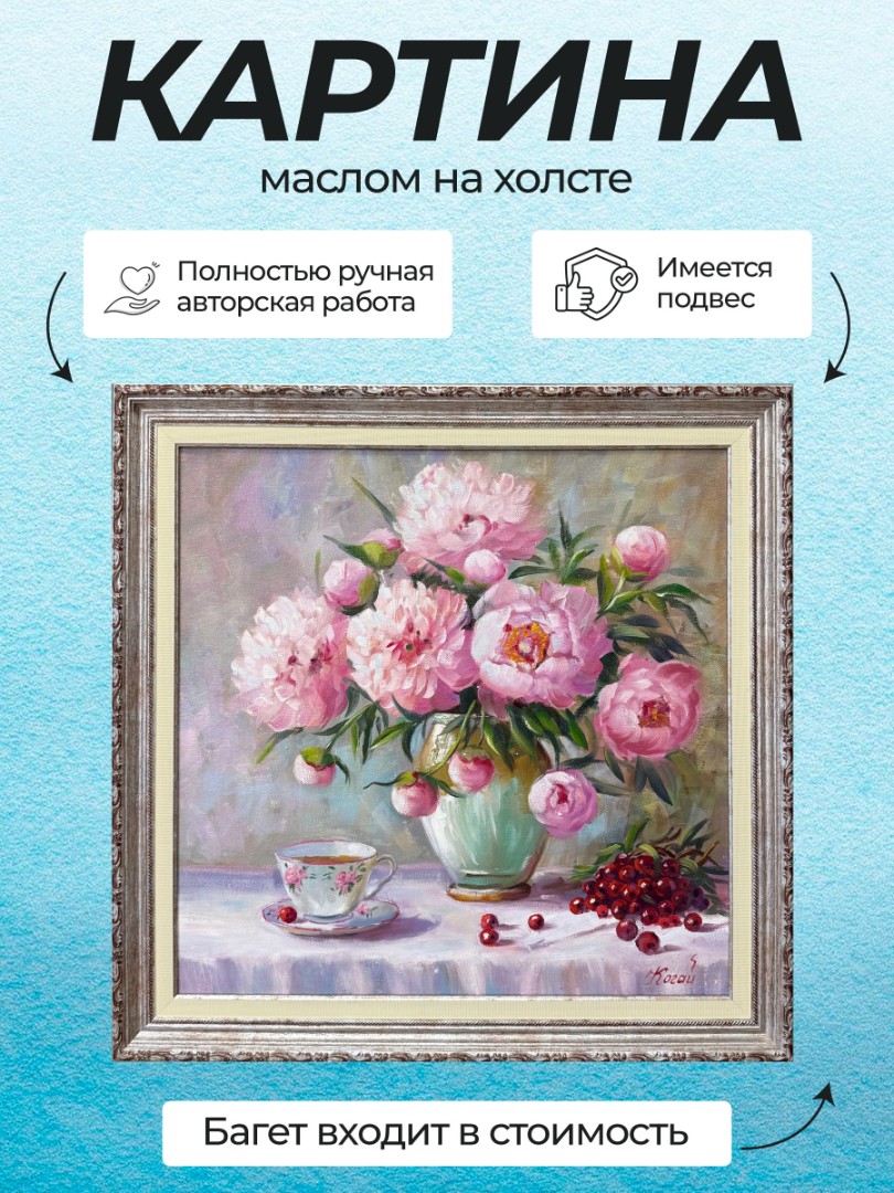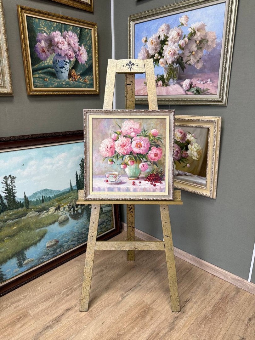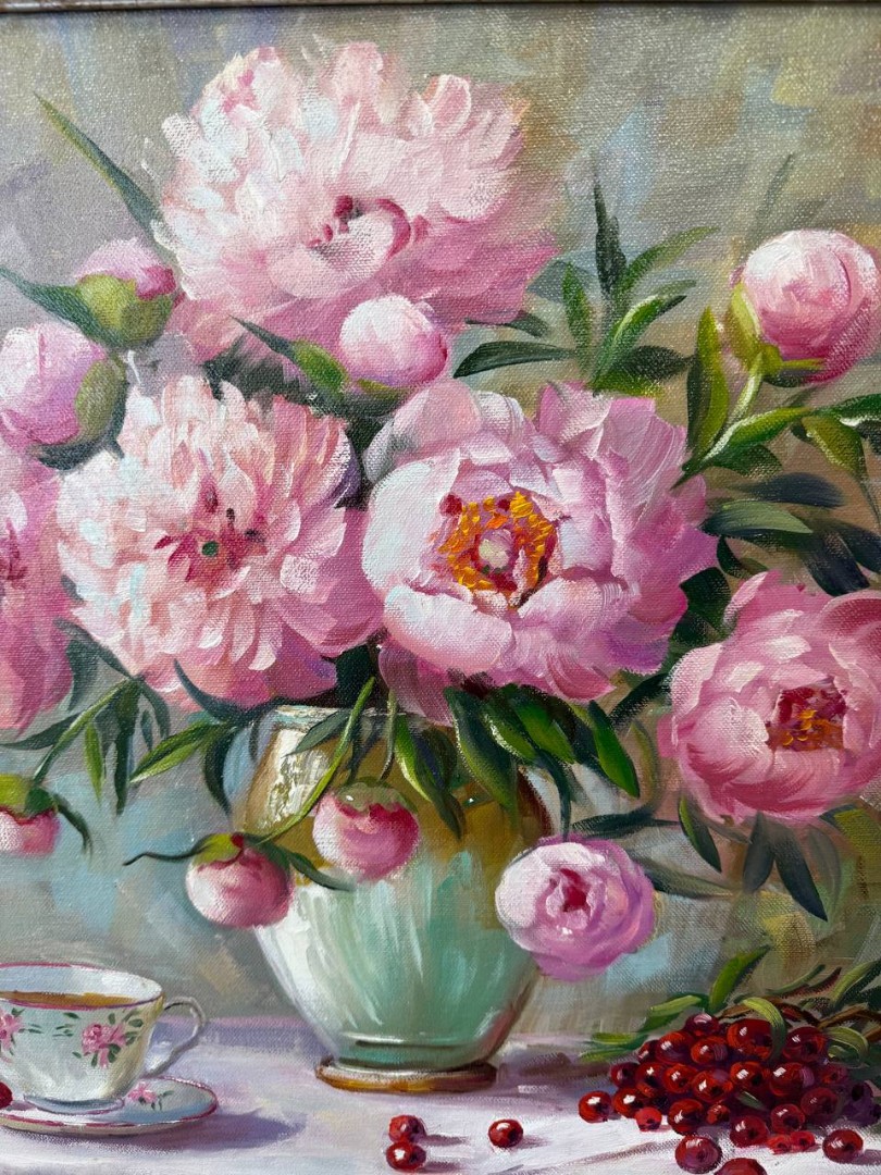 На картине изображены розовые пионы, расцветающие в вазе, расположенной на столе. Их нежные лепестки переливаются в мягком свете, создавая атмосферу уюта и тепла. Ваза имеет изящный силуэт, подчеркивающий красоту цветов.