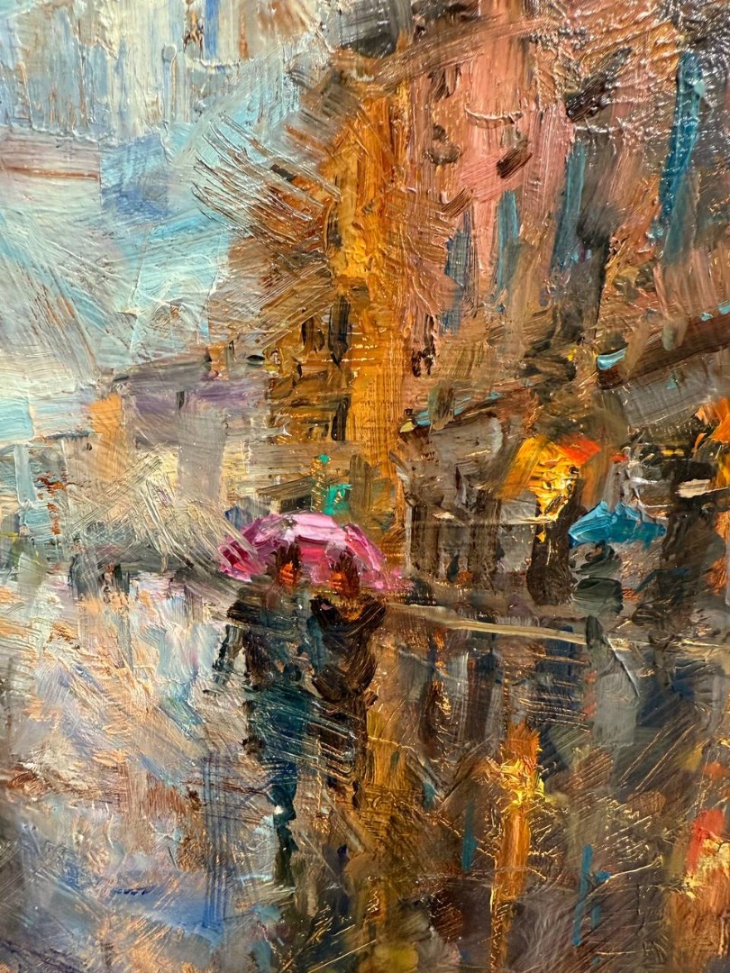 Цветовая гамма картины включает в себя тёплые оттенки, которые контрастируют с серым цветом дождя. Это создаёт ощущение тепла и комфорта, несмотря на непогоду.