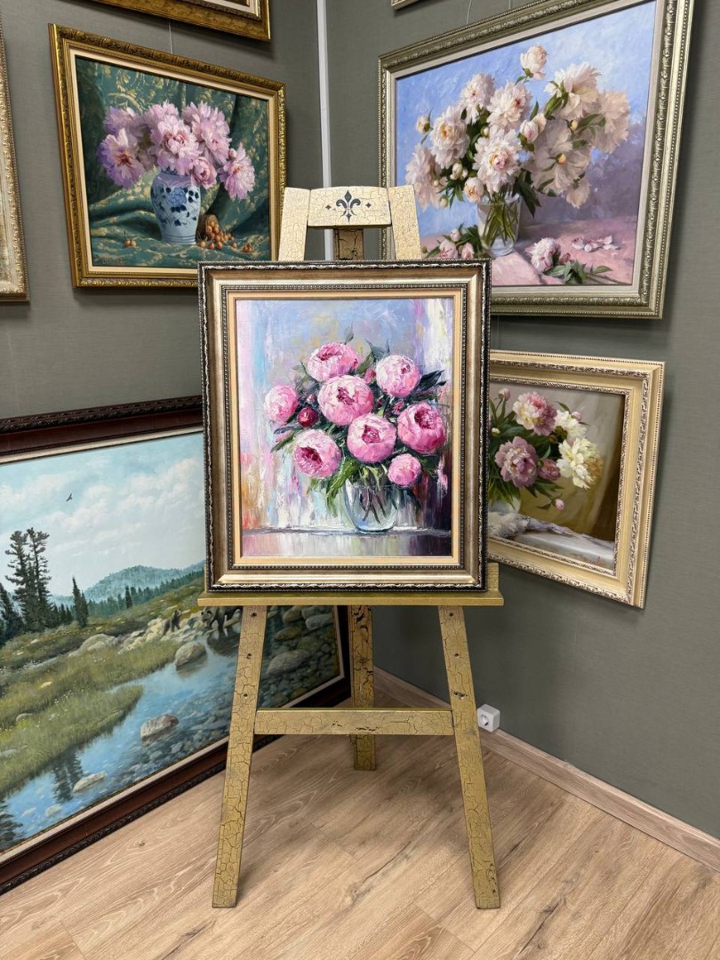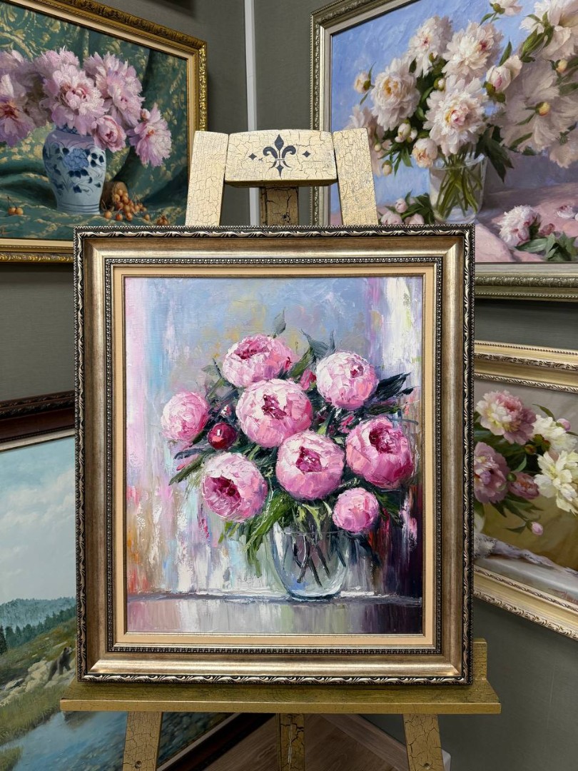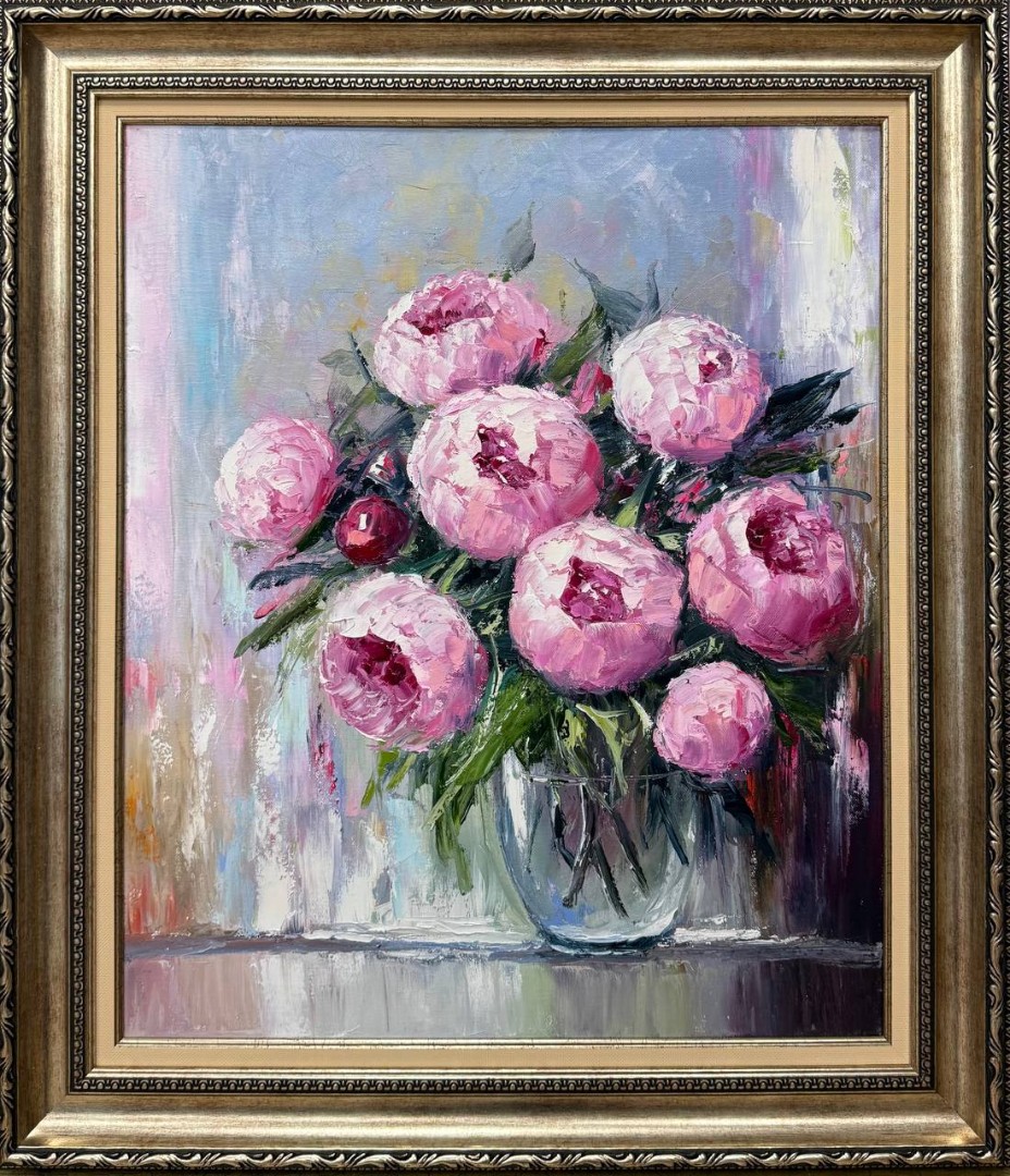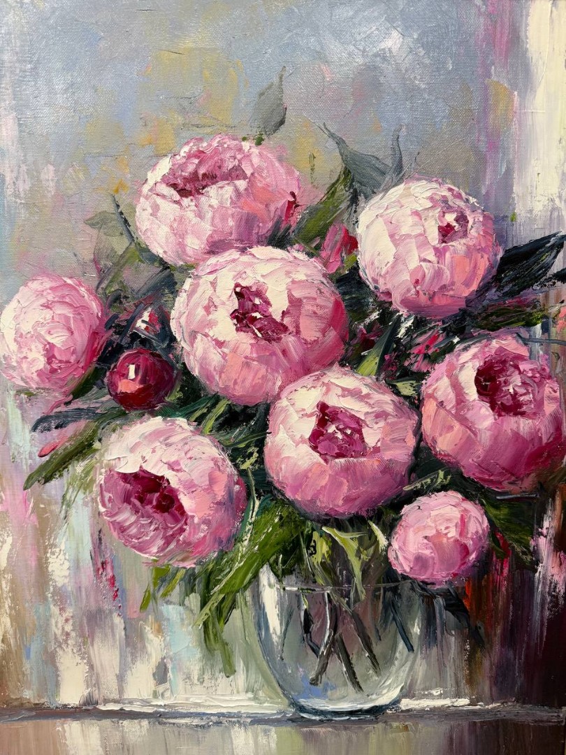 На картине изображен изящный букет розовых бутонов пионов, которые изящно расположены в прозрачной вазе. Ваза выполнена из стекла, благодаря чему её форма и текстура прекрасно отражают свет, создавая игру бликов и теней.