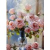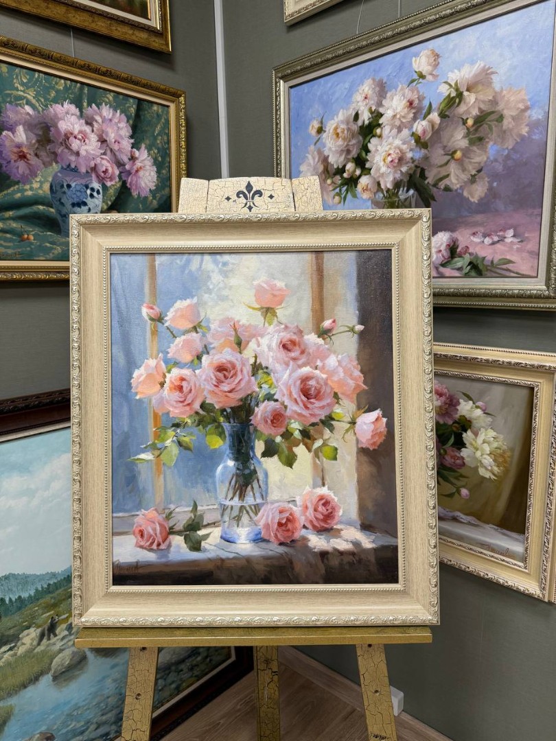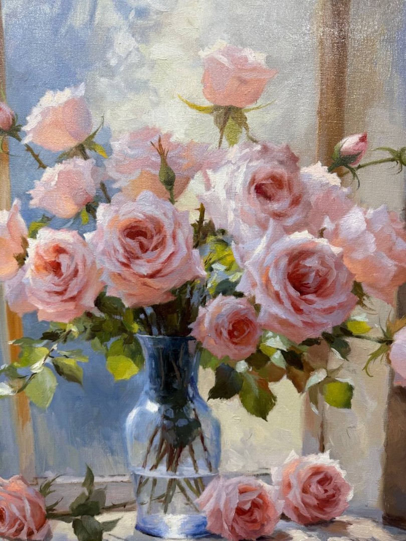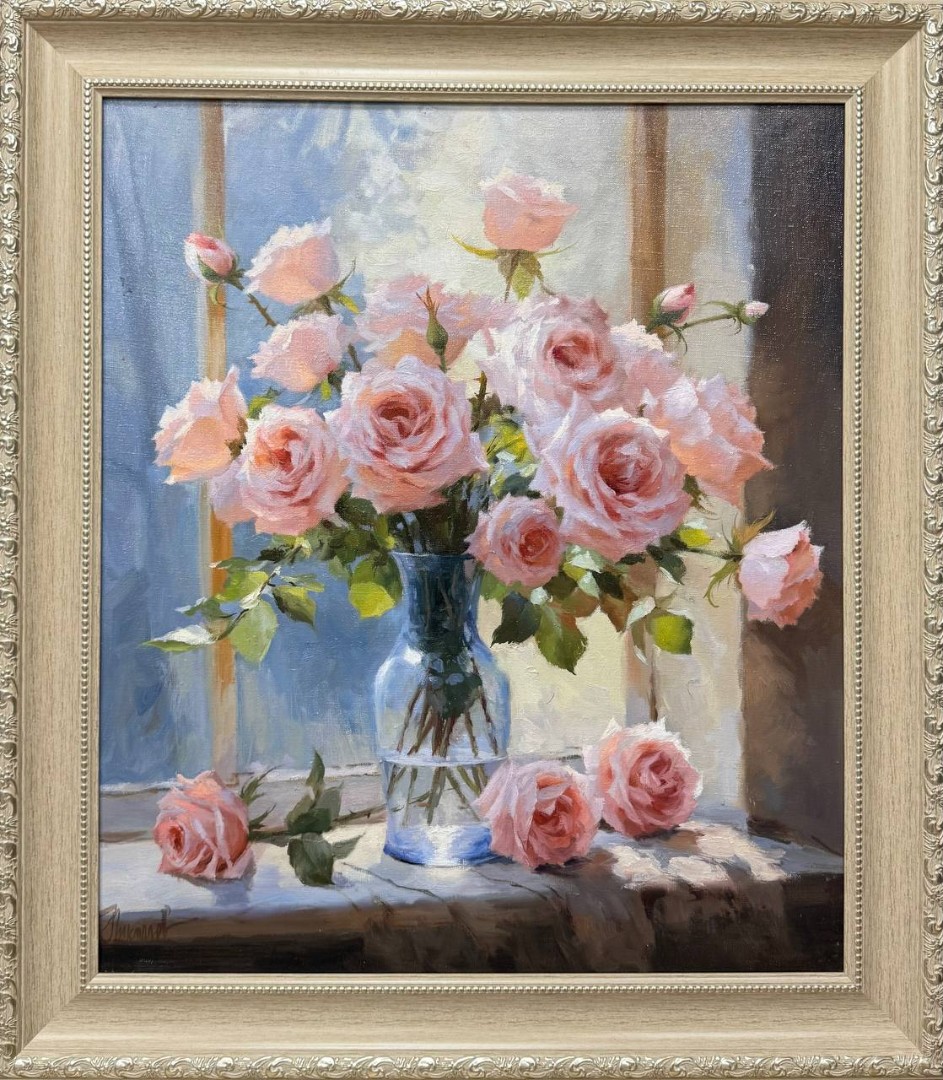 На картине изображены нежные розовые розы, аккуратно расположенные в прозрачной стеклянной вазе. Ваза, отражая мягкий свет, создает эффект легкости и воздушности. Розы распускаются, их мягкие лепестки словно нежно играют с солнечными лучами, наполняя пространство вокруг теплом и уютом.