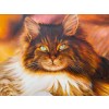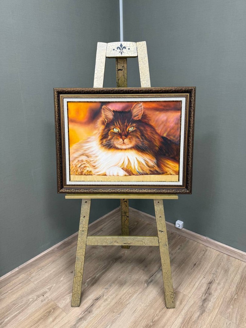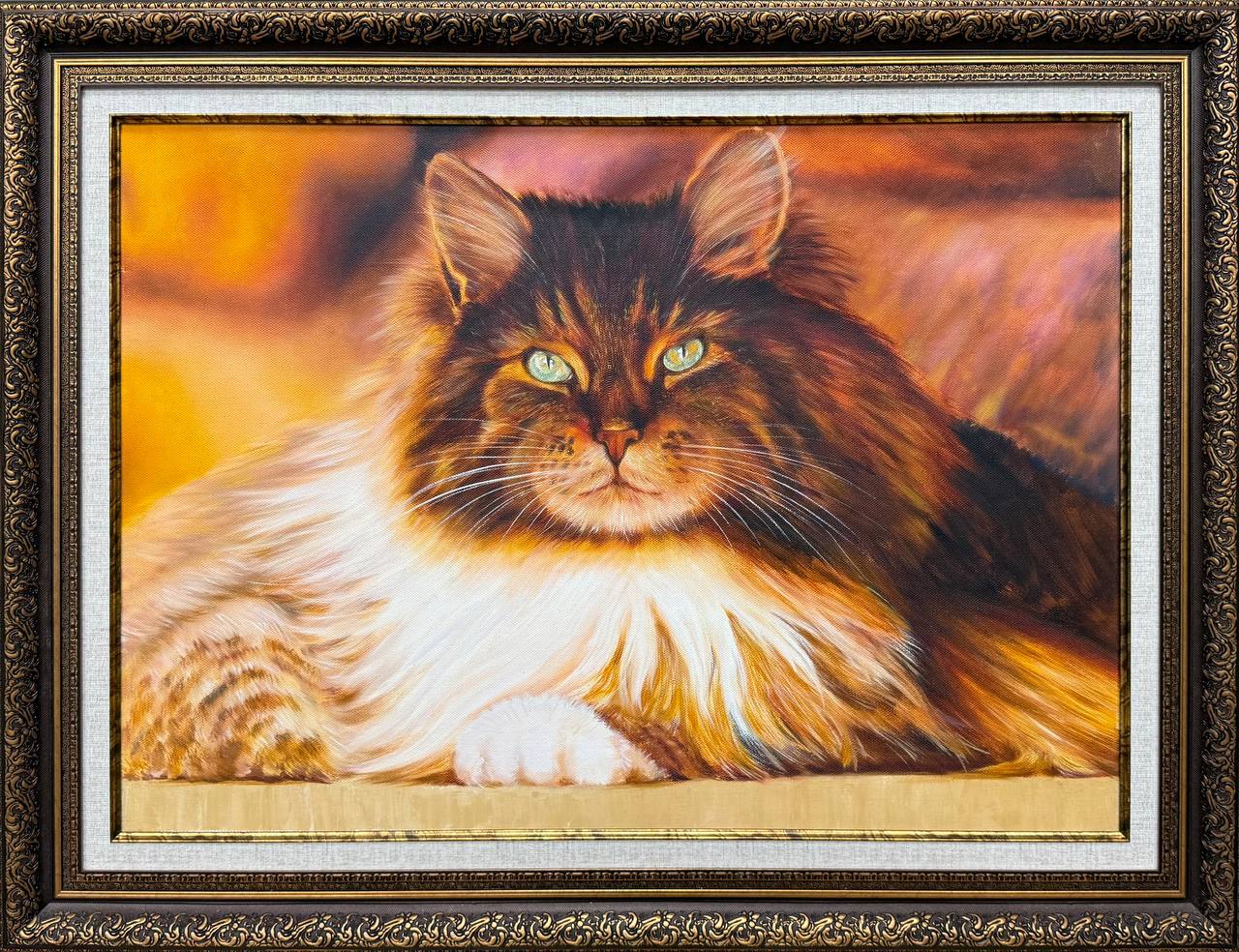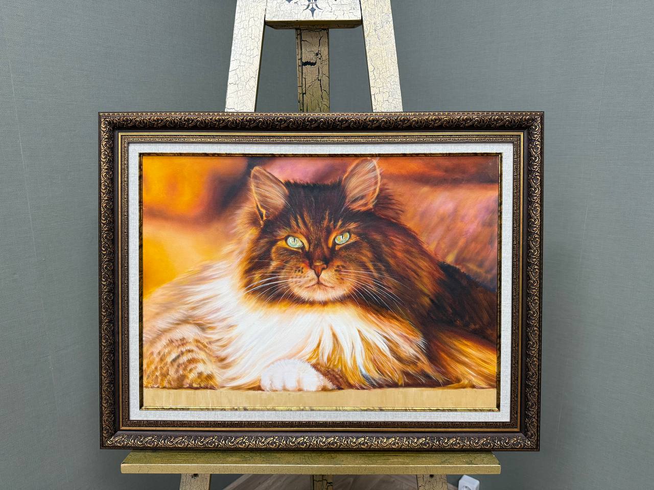 На картине изображен большой рыжий кот. Его шерсть, переливающаяся оттенками медного и золотистого, поражает своей яркостью и теплотой. Кот лежит, удобно притулившись, его массивное тело в расслабленной позе, а длинный хвост слегка приподнят и изогнут.