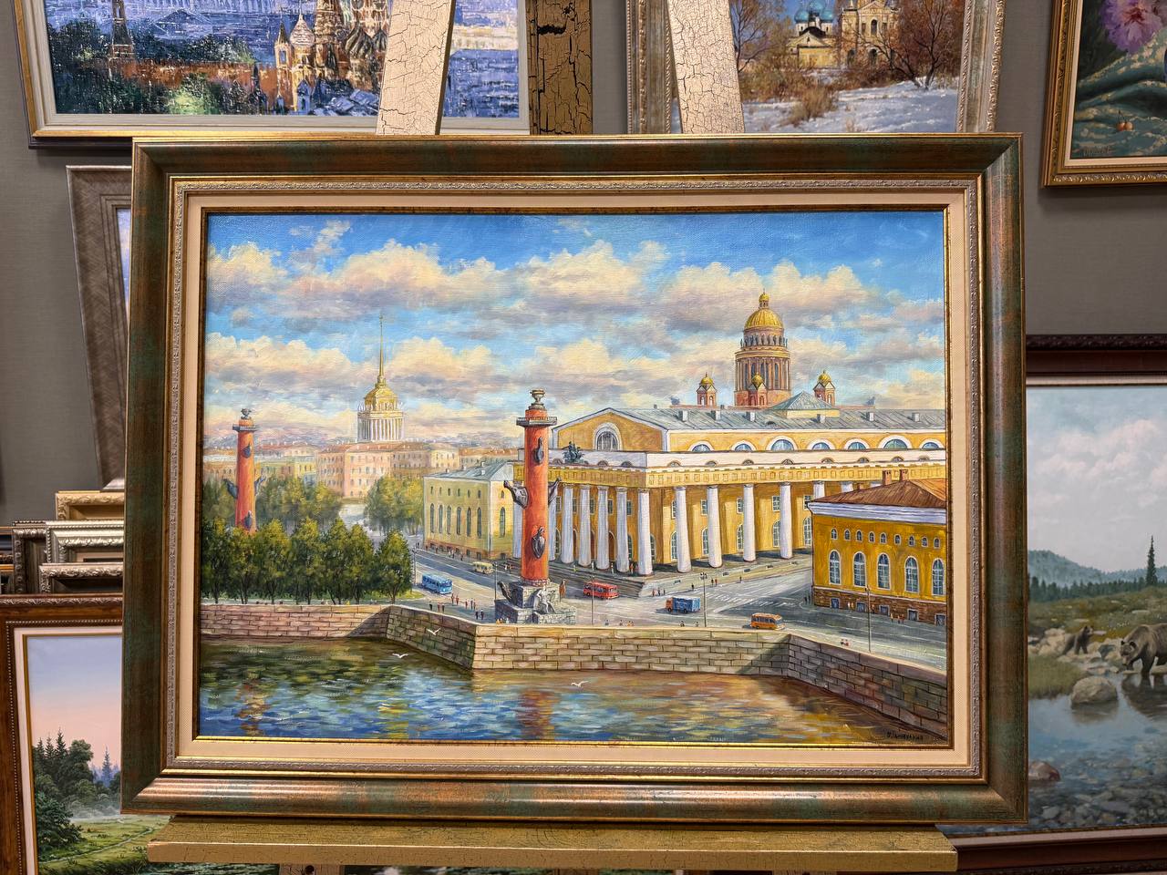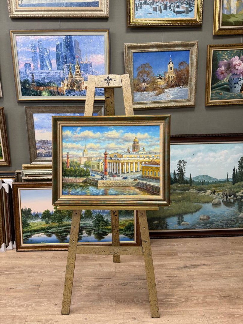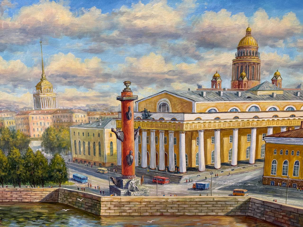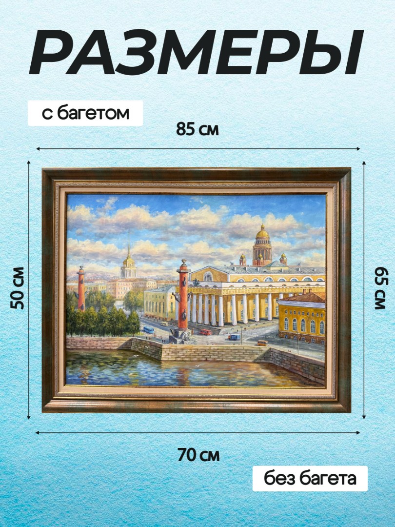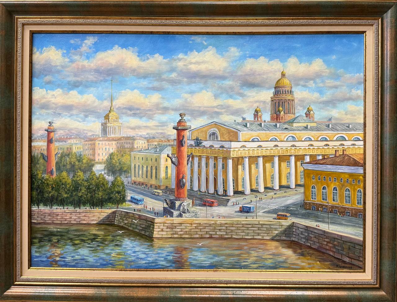 На картине, изображающей Санкт-Петербург летом, солнечный день наполняет город яркими красками и теплом. Стрелка Васильевского острова, знаменитая своими историческими зданиями и живописными пейзажами, становится центральной частью композиции. Реки Невы блестят под солнечными лучами, освещая не только воду, но и расположенные вдоль набережной красивые дома с их традиционной архитектурой.