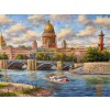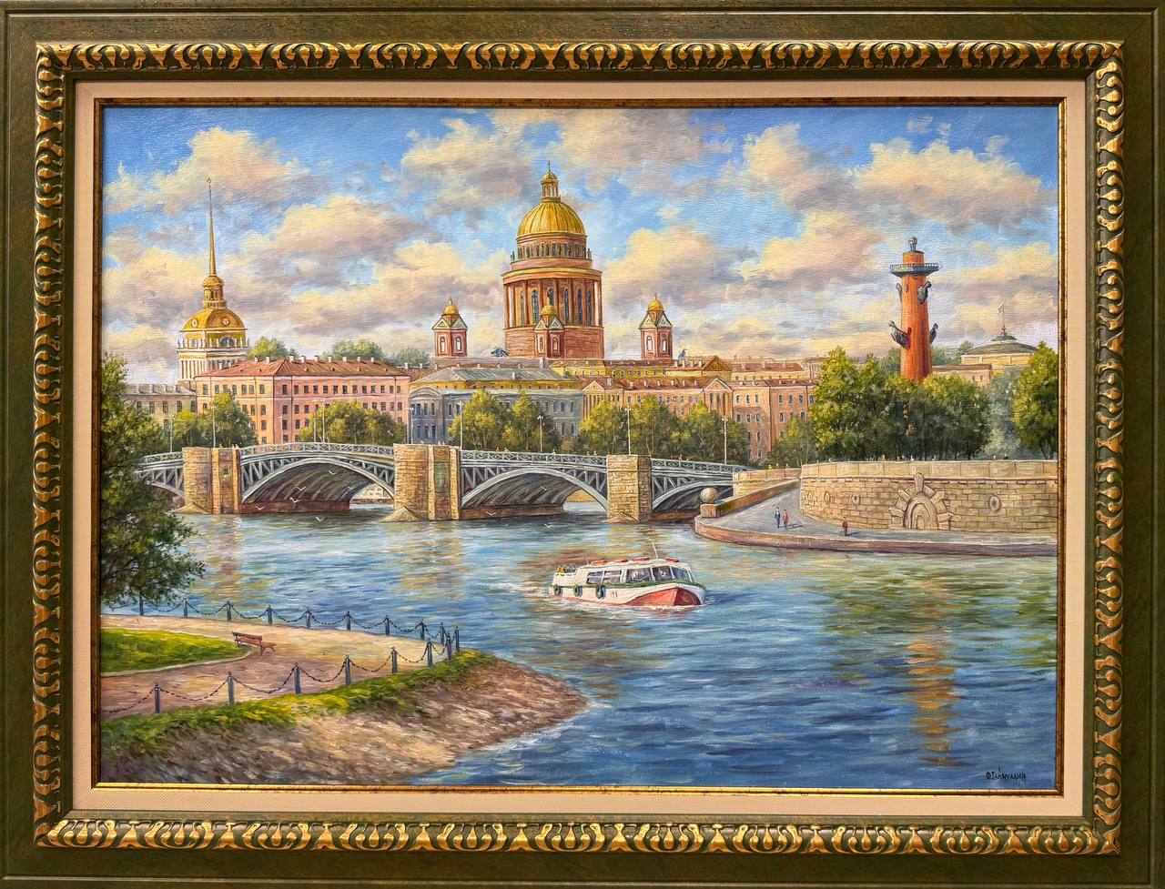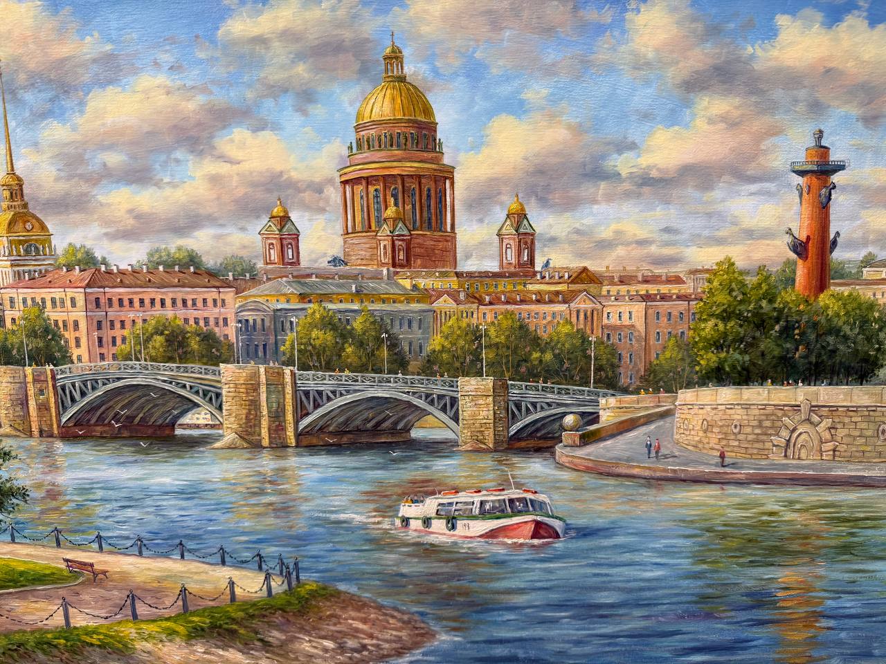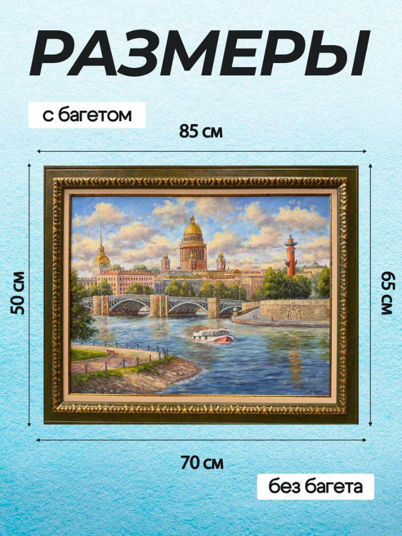 По центру картины виден мост, который соединяет два берега реки. Мост украшен фонарями и пешеходами, которые спешат по своим делам или просто наслаждаются панорамой. По обеим сторонам Невы тянутся красиво оформленные набережные с зелеными деревьями и зданиями, отражающими богатое архитектурное наследие города.