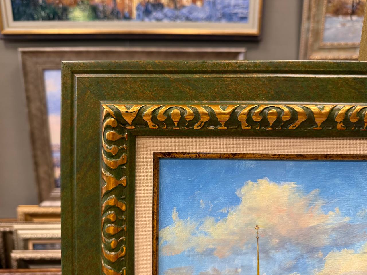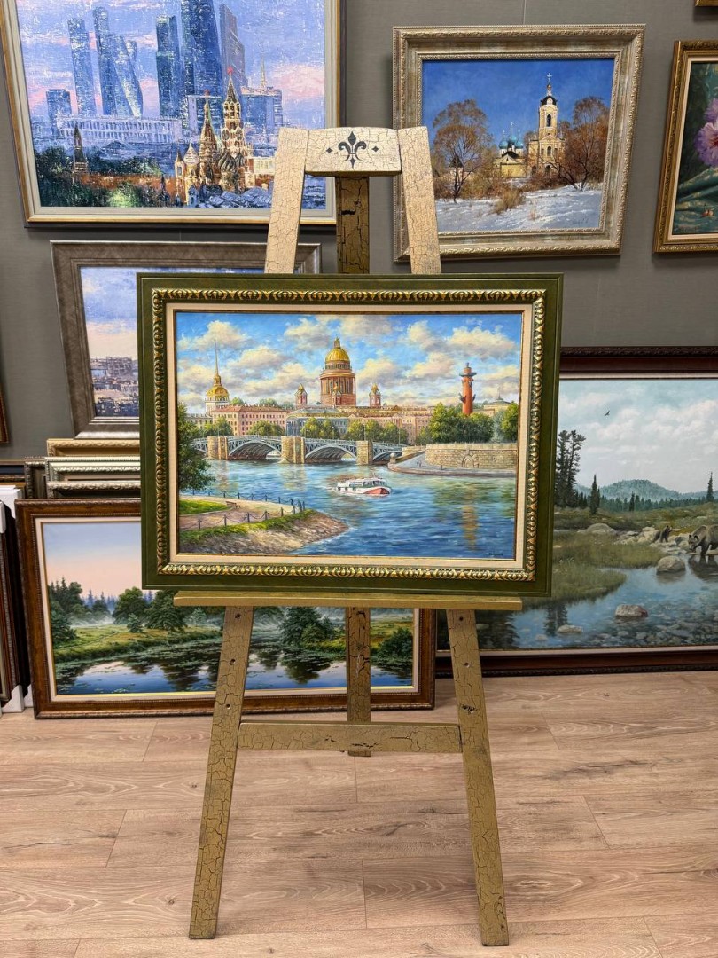 На картине изображен прекрасный вид на Исаакиевский собор в Санкт-Петербурге. Здание с его величественным куполом, покрытым золотом, контрастирует с голубым небом. Его архитектурные детали, такие как колоннада и статуи на крыше, создают ощущение грандиозности и величия.