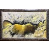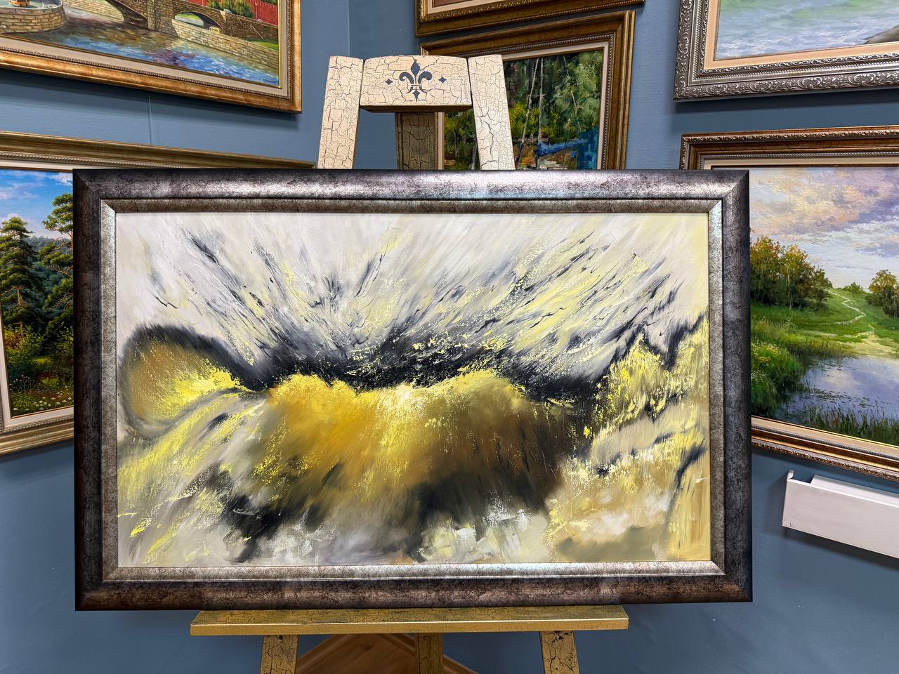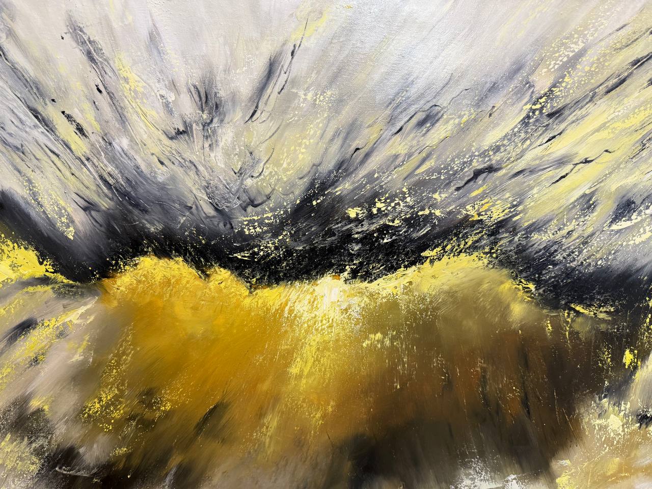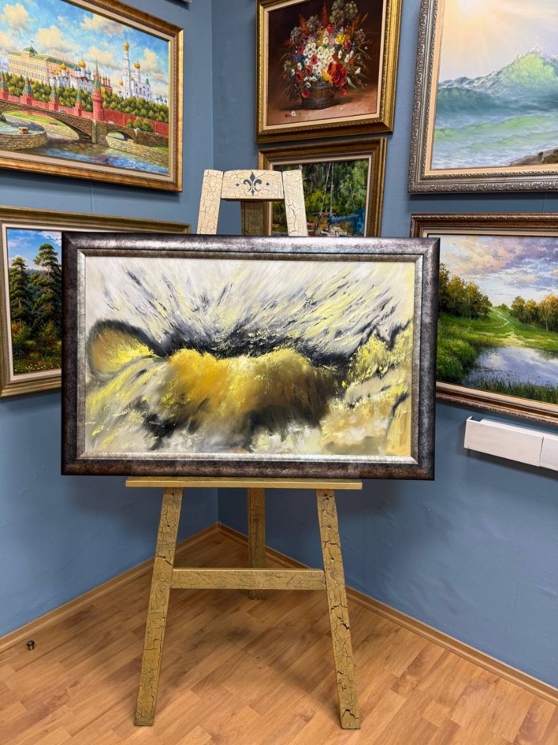 Серо-золотые оттенки придают картине глубину и насыщенность. Волнообразные линии и всполохи цвета напоминают о морских просторах и природных явлениях.