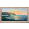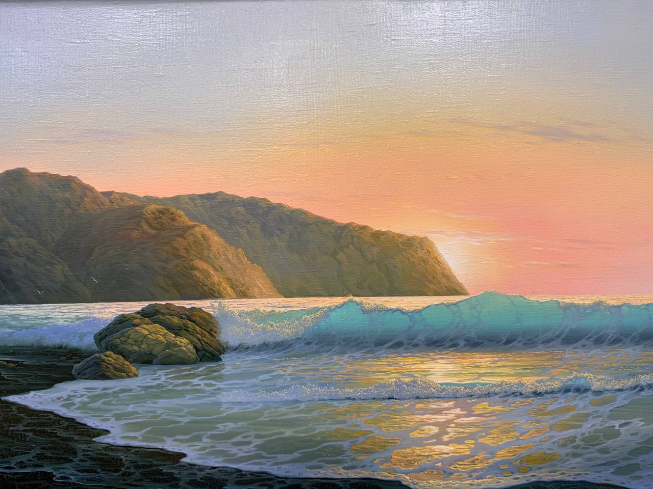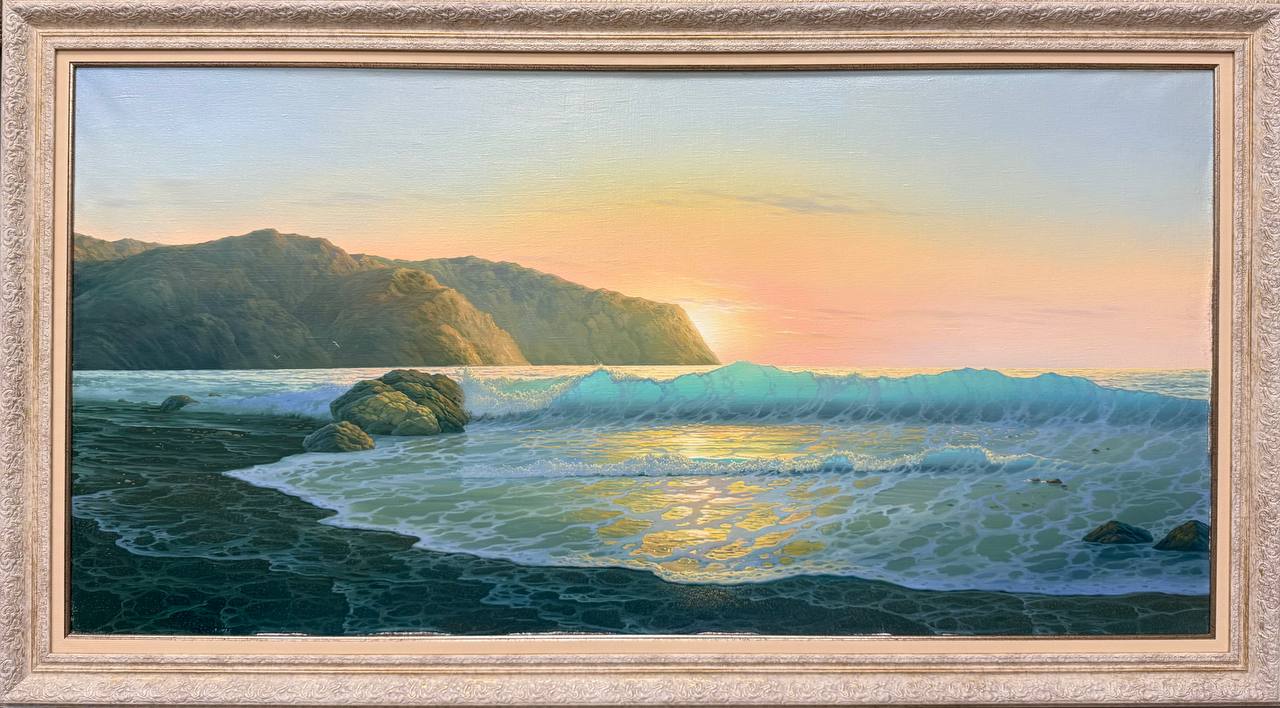 На картине изображено живописное морское побережье. Яркое солнце, нежно выглядывающее из-за гор, наполняет сцену теплотой и светом. Его золотистые лучи отражаются в спокойных и прозрачных водах моря, создавая искрящиеся блики на поверхности.