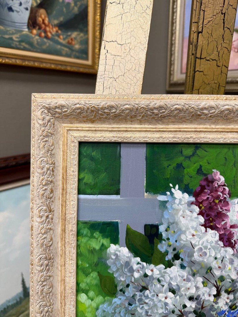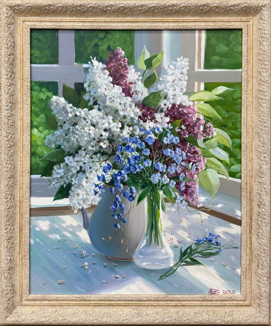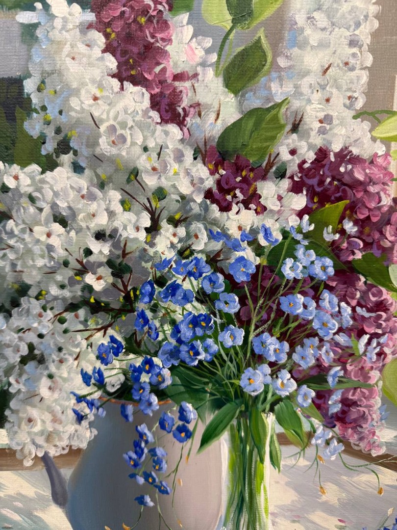Картина написана маслом на холсте, цветы "Сирень и незабудки".