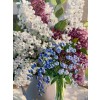 Ваза выполнена из тонкого стекла, ее чистые линии подчеркивают красоту цветов. Сирень, собранная в пышные соцветия, нежно белого оттенков, великолепно контрастирует с нежными голубыми незабудками. Их мелкие цветочки словно искрятся на фоне крупной сирени, придавая композиции легкость и свежесть.