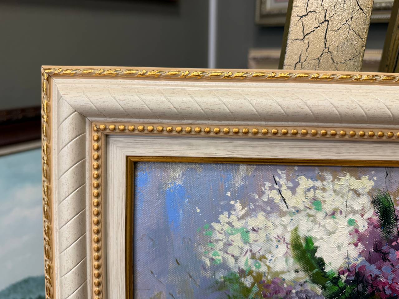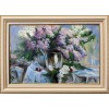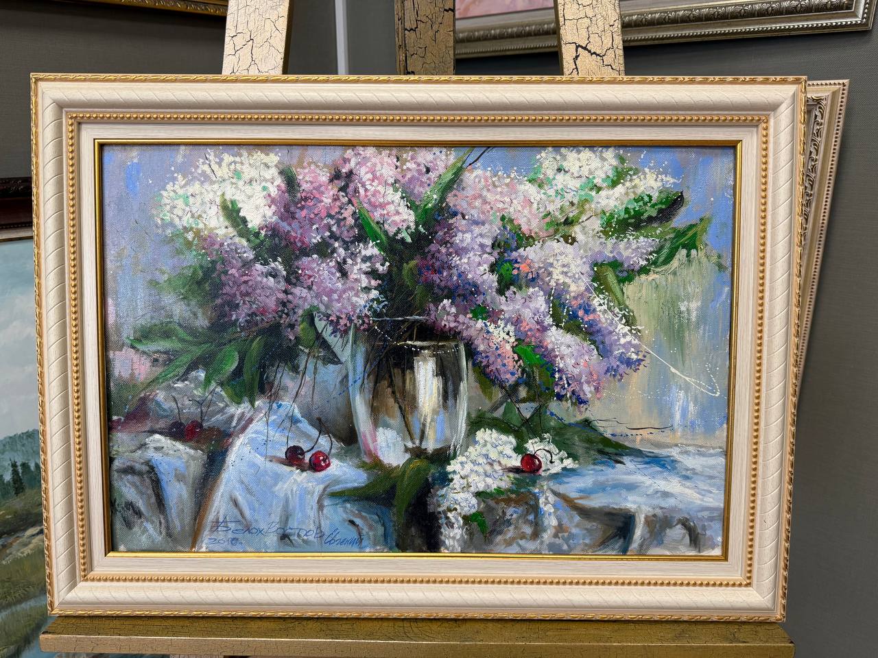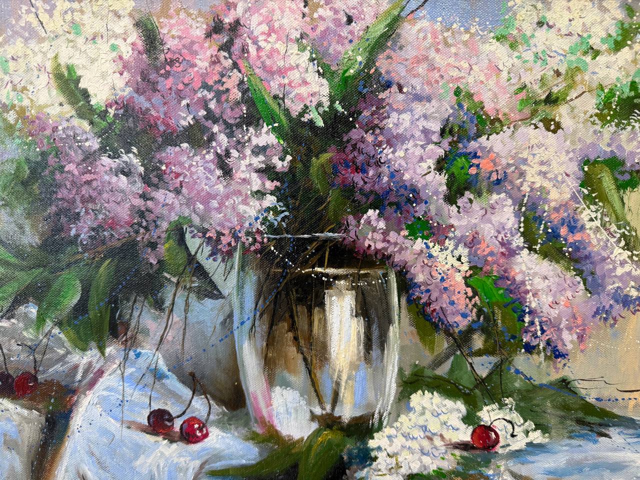 Картина написана маслом на холсте, цветы "Сирень и вишня".