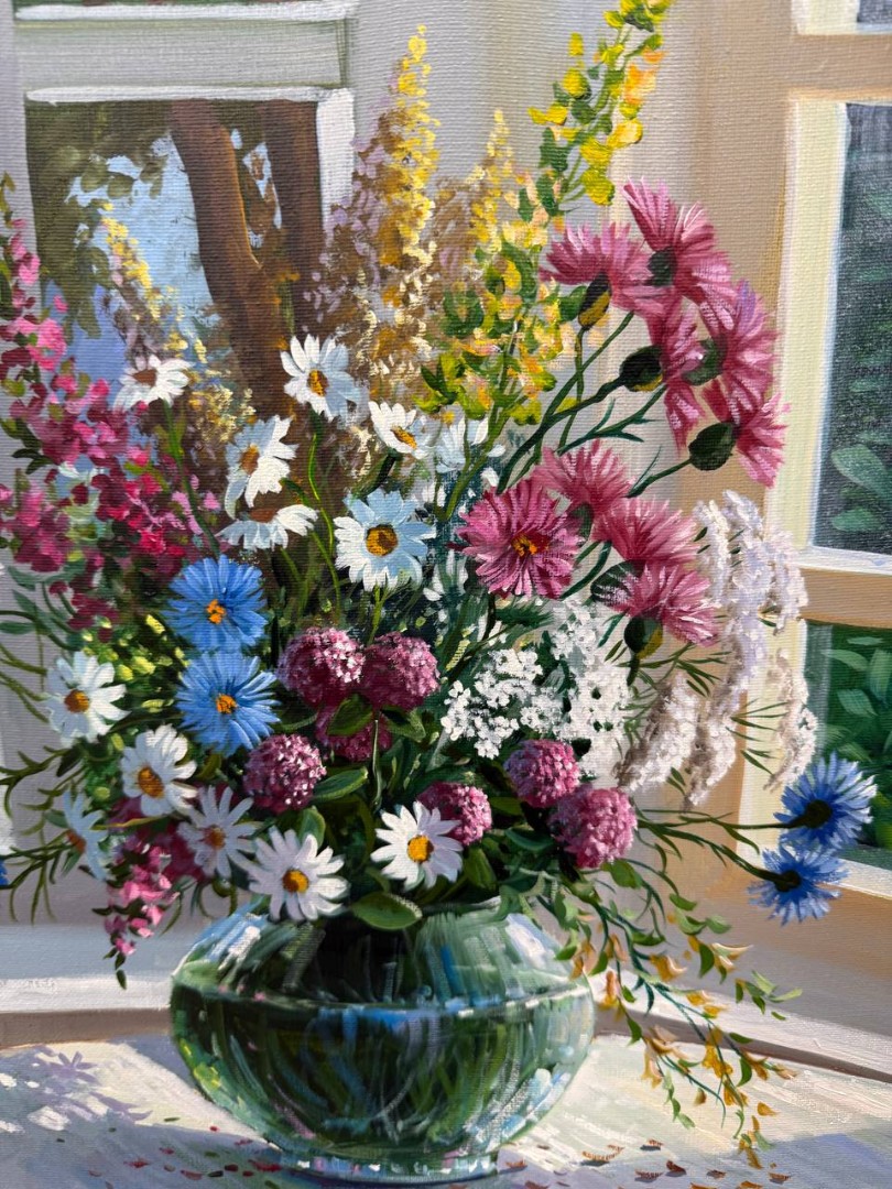 Перед вами картина, изображающая букет летних цветов в прозрачной вазе, стоящий на деревянном столе у окна на веранде. Яркие, насыщенные цвета цветов наполняют пространство жизнью и радостью.