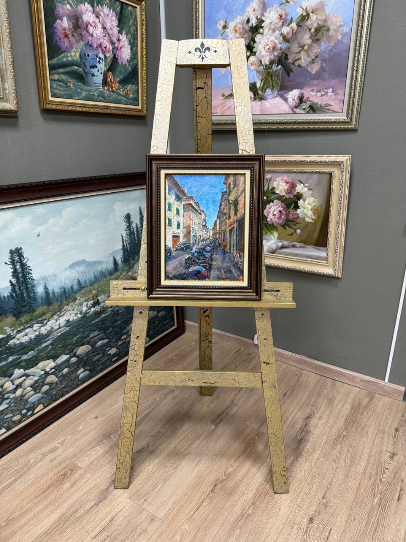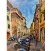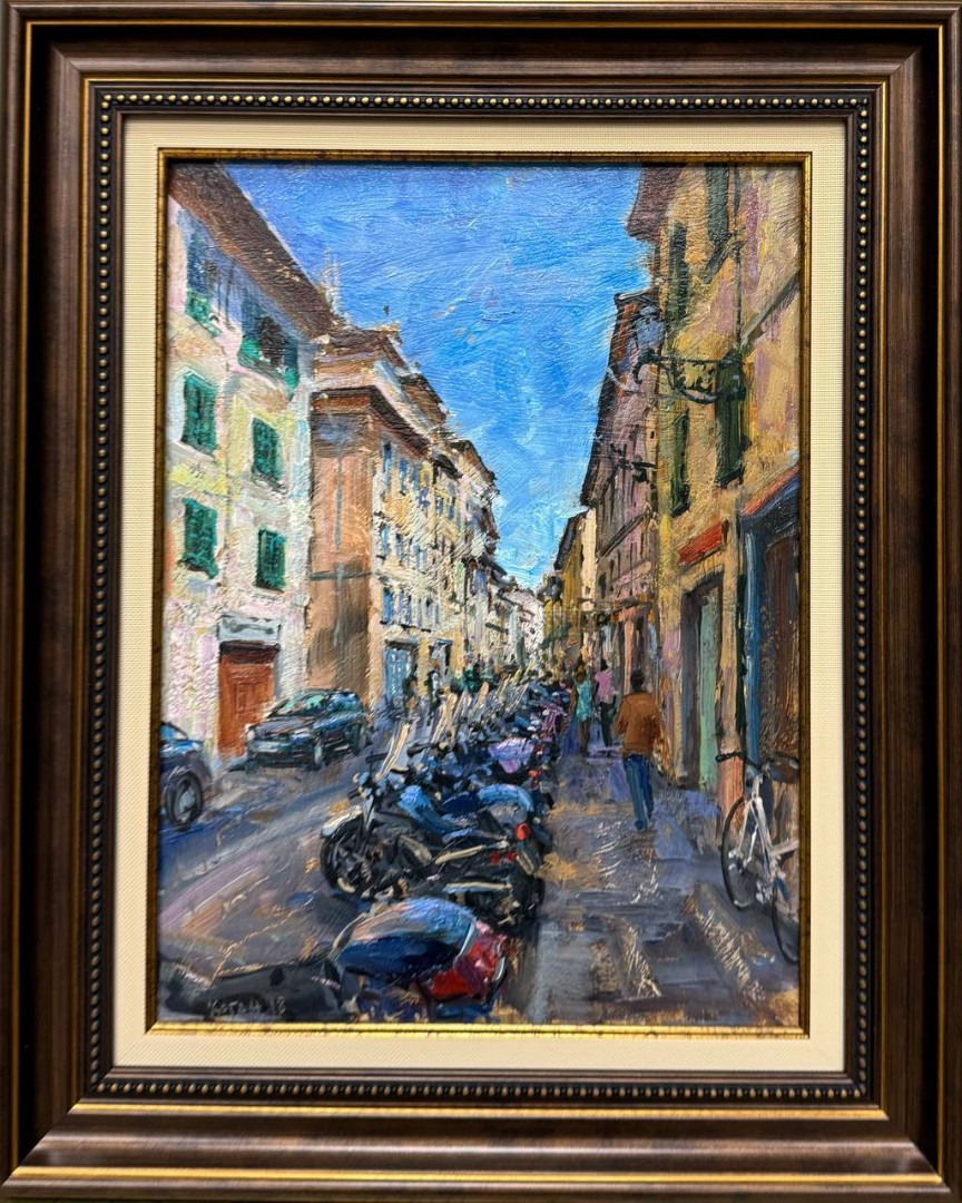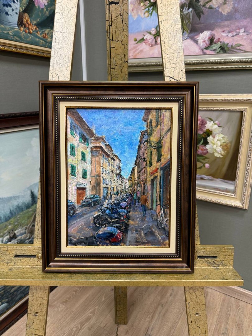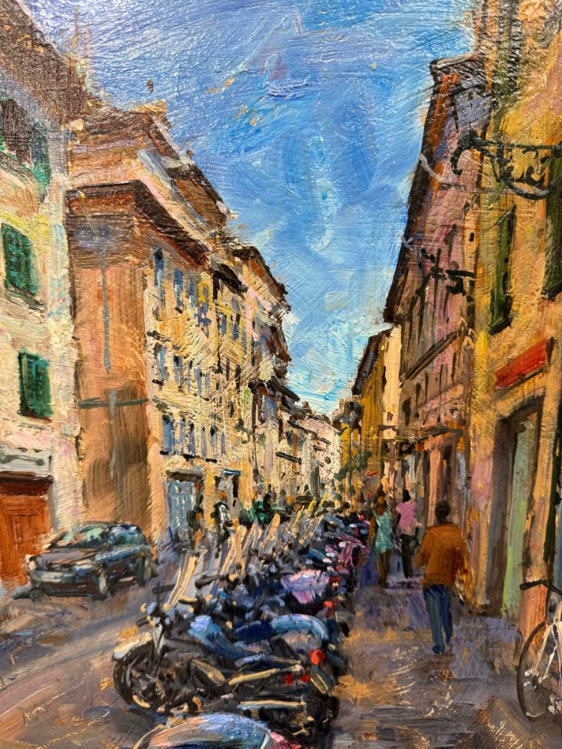 Летняя зелень растений, цветущие балконы и яркие вывески добавляют ярких красок этой динамичной городской сцене. Общая атмосфера картины наполнена теплом и жизнью, передавая дух итальянского лета.