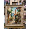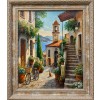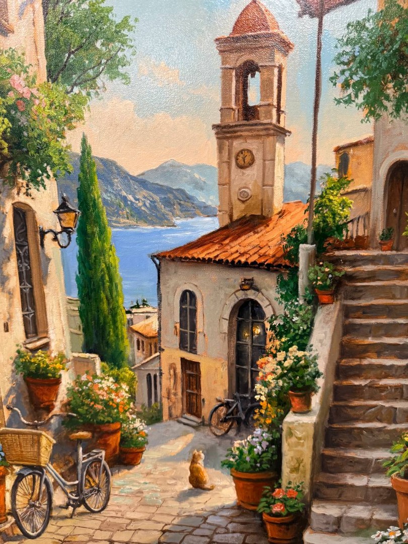 На картине изображена южная улица, плавно спускающаяся к морю. По обеим сторонам дороги стоят уютные домики с яркими крышами, подчеркивающими атмосферу солнечного и радостного городка. У одного из домов стоит велосипед, придавая сцене ощущение спокойной жизни и местного быта.