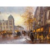 На картине изображен живописный осенний пейзаж, наполненный теплыми желтыми и золотыми оттенками. Улица заполняется людьми, которые идут, закутавшись в теплую одежду. Мужчины в шляпах и цилиндрах уверенно шагают вдоль дороги, обсуждая что-то между собой, а женщины в длинных платьях прогуливаются по тротуару.