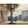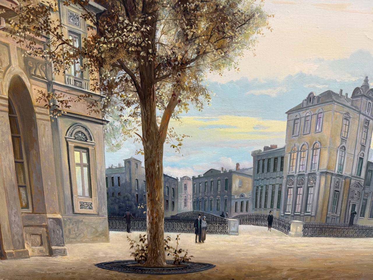 На картине изображен старый город с уютной атмосферой. Старые улочки, а вокруг стоят старинные здания с кирпичными фасадами и балконами. На улицах немного людей: кто-то неспешно идёт по тротуару, а кто-то остановился, чтобы пообщаться с друзьями.
