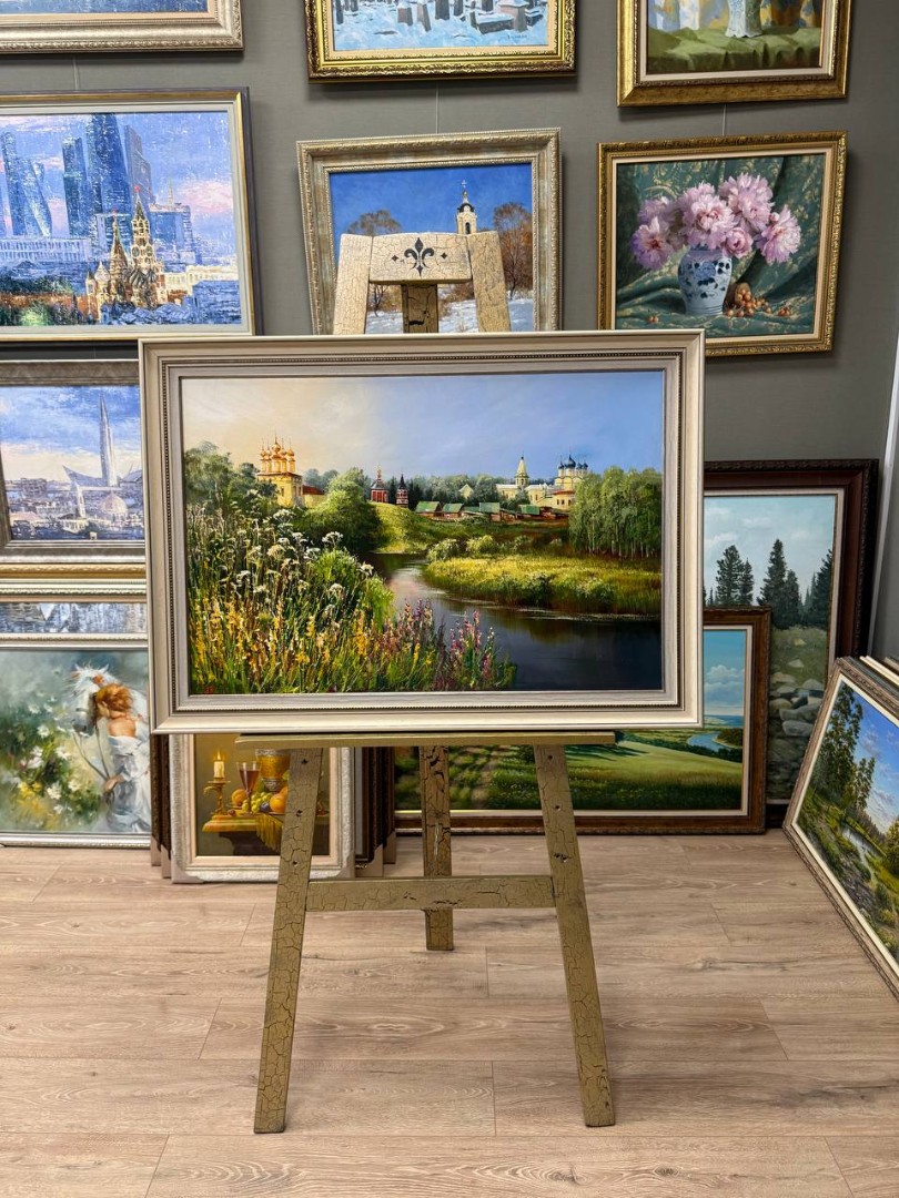 Полотно дышит величием древнерусской истории и безмятежной красотой летнего дня. Это гармоничный сплав природы и архитектуры, где золото куполов сияет под солнцем, а река несёт свои воды сквозь века. Картина наполнена светом, покоем и торжественной чистотой.