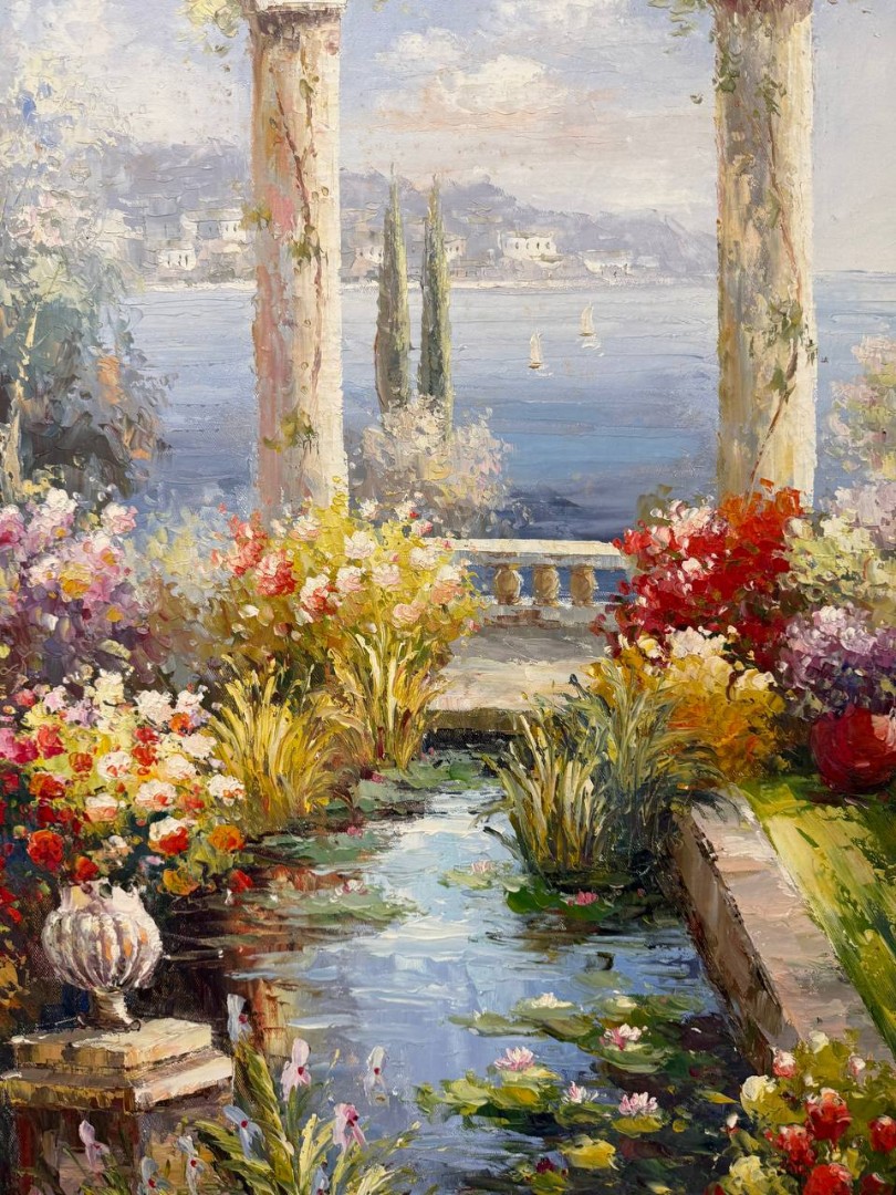 На картине изображена прекрасная терраса, расположенная у самого моря. Солнечные лучи приятно согревают воздух и создают волшебную атмосферу. Терраса устлана мягким плиточным покрытием, а вокруг нее располагаются цветущие растения — яркие красные, желтые и синие цветы, создающие живописный контраст с зелеными листьями.