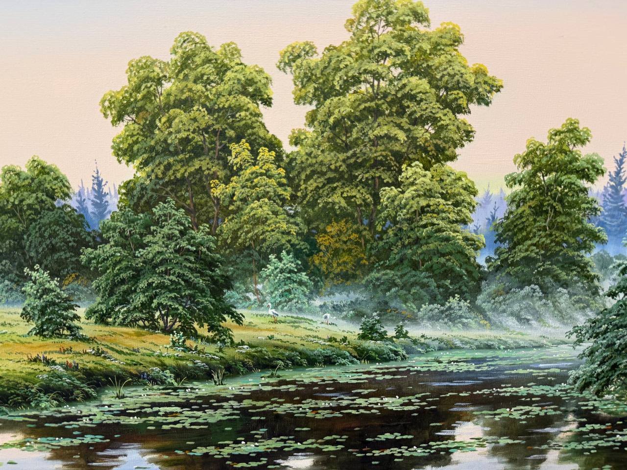 На картине изображен летний день в тихой заводи, где спокойная вода отражает безмятежное небо. Вода прозрачная, с легкими волнами, которые играют на поверхности, создавая восхитительные отражения зелени леса вокруг.