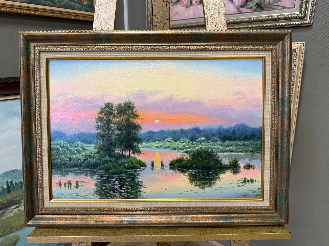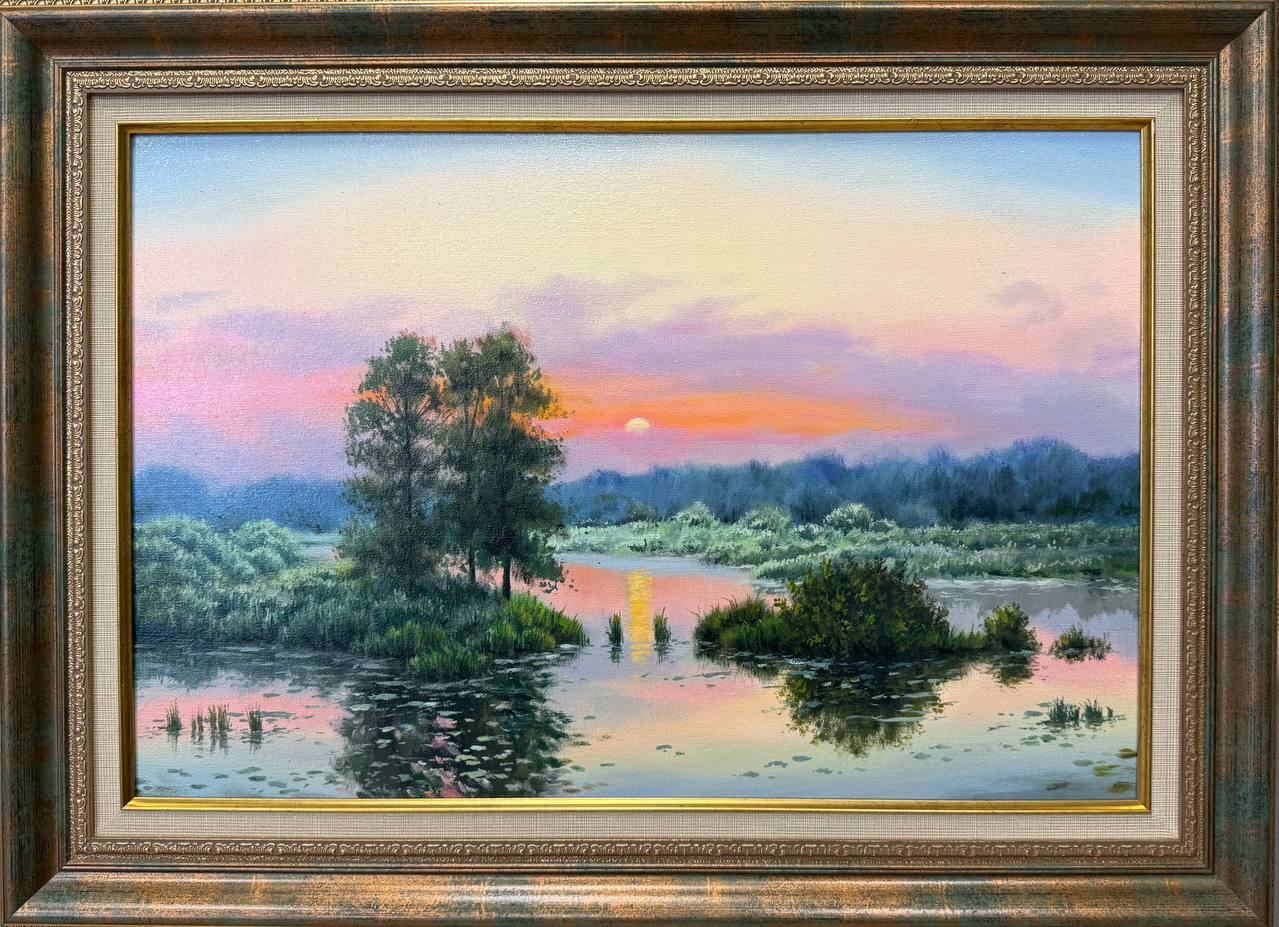 На картине изображён живописный лес в утренние часы, когда первые лучи солнца только начинают пробиваться сквозь густую листву деревьев. Вода в водоёме отражает нежные пастельные тона рассвета: розоватый, золотистый и лёгкий голубой свет, словно покрывало, укрывающее ландшафт.
