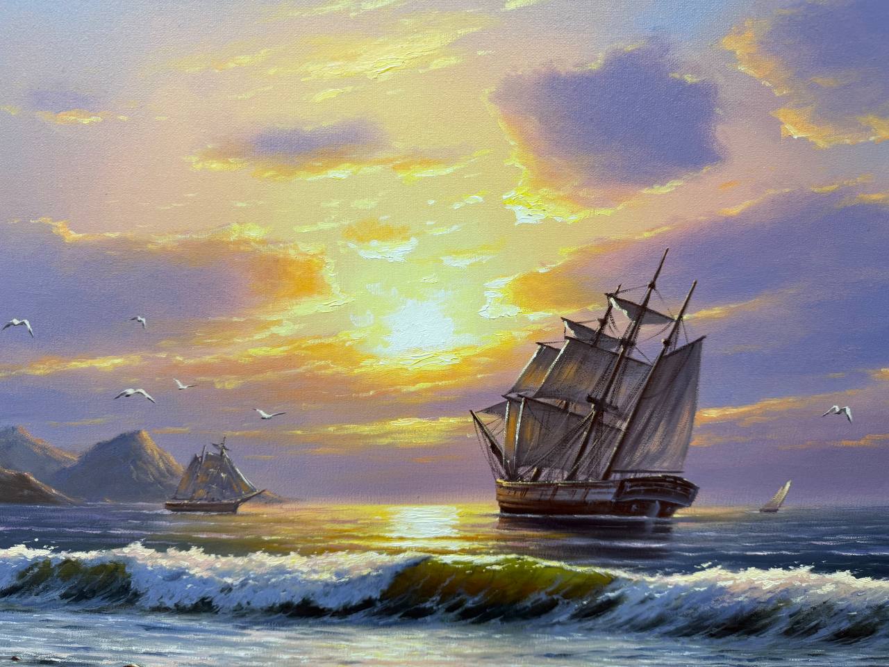 На картине изображен живописный морской пейзаж, где яркое солнышко мягко освещает бескрайние воды океана. У самого берега можно увидеть два крупных парусника, величественно раскачивающихся на легких волнах.