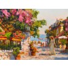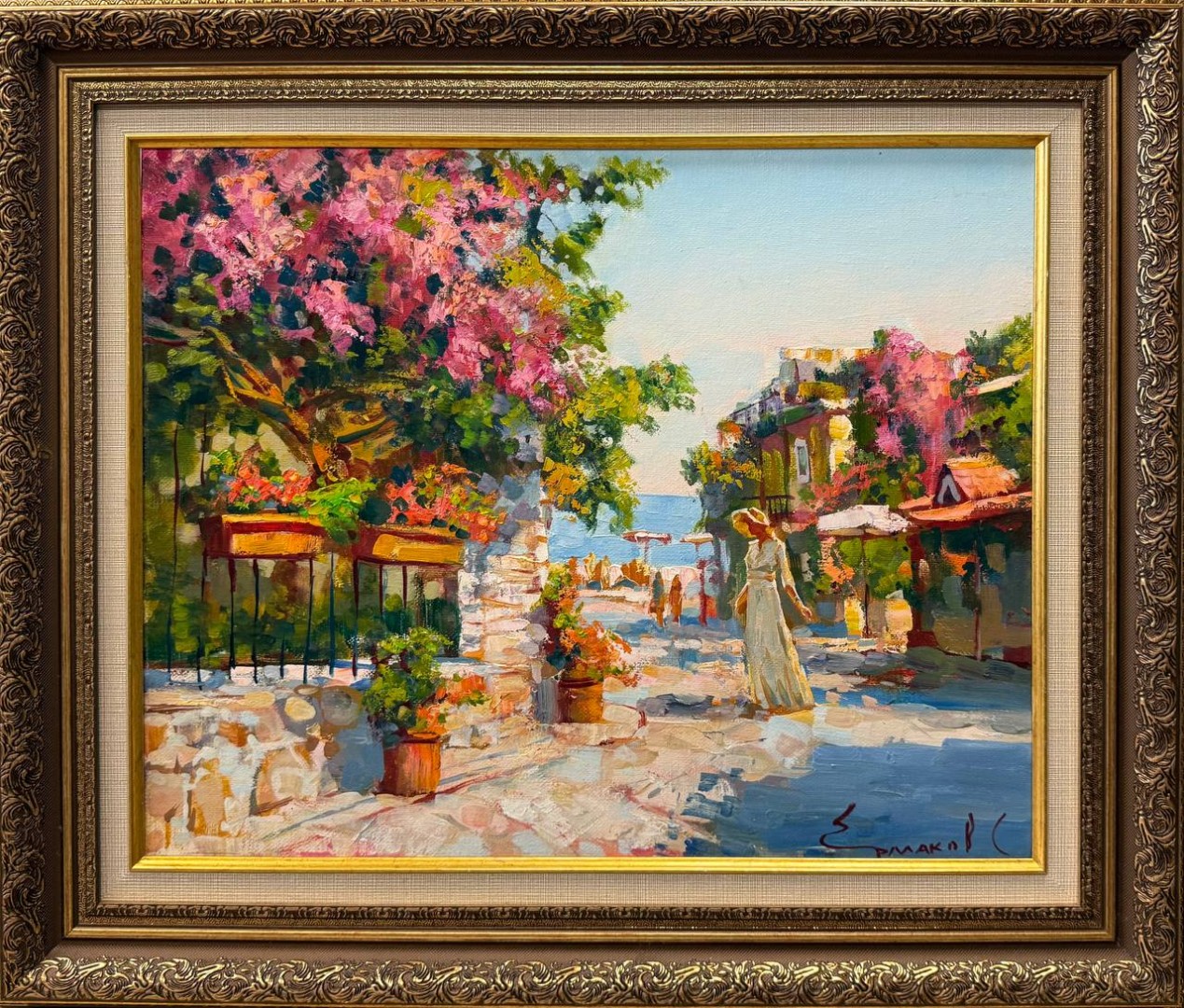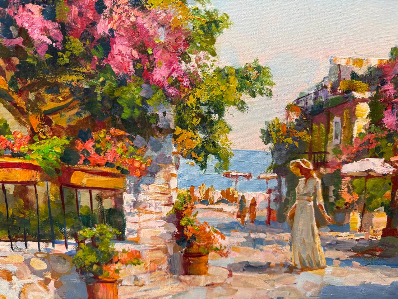Вдали, за улочкой, виднеется блеск моря, его безмятежные волны встречаются с горизонтом, создавая ощущение бескрайности. На переднем плане девушка в красивом легком платье и шикарной шляпке, с легкой улыбкой на лице, прогуливается по улице. Ее волосы развиваются на ветру, добавляя динамики в спокойную атмосферу. Она олицетворяет летнее настроение и расслабленность, наполняя картину жизнью. Окружение, наполненное цветами и светом, создает идеальное место для прогулок и наслаждения красотой Барселоны.