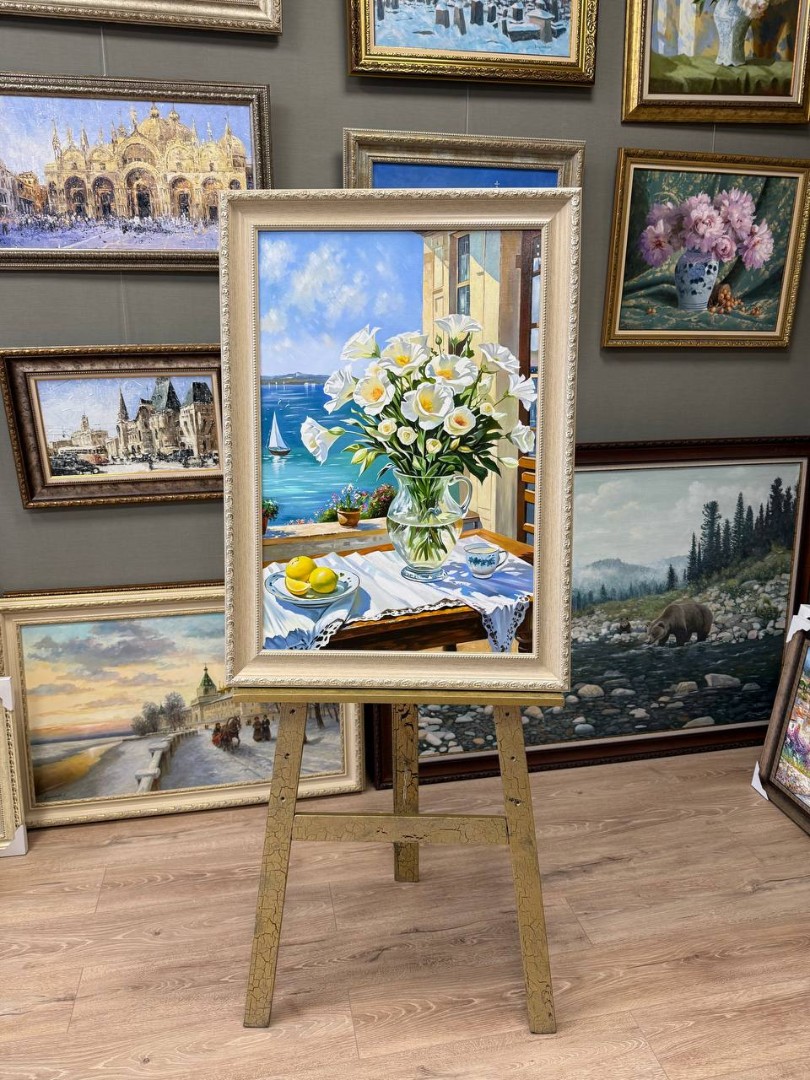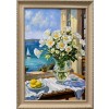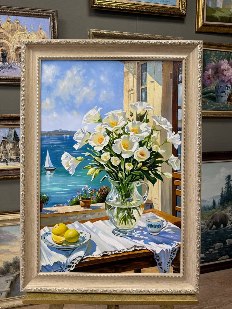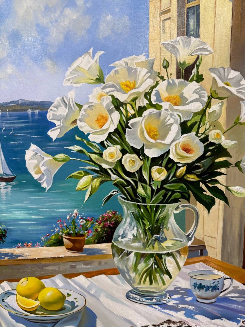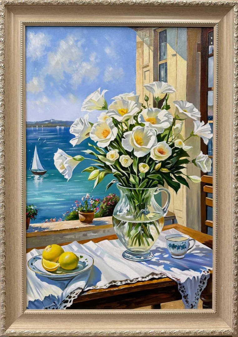Из окна, расположенного позади вазы, открывается вид на море. Лазурные волны и яркое солнце добавляют картине ощущение спокойствия и гармонии. На горизонте видны парусники, которые придают сцене динамики и романтики.