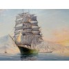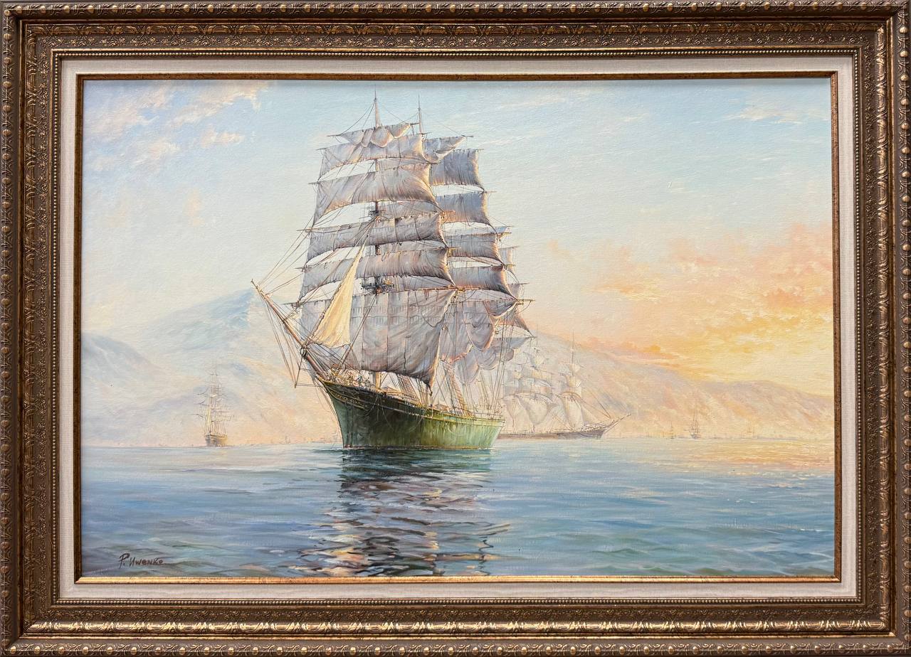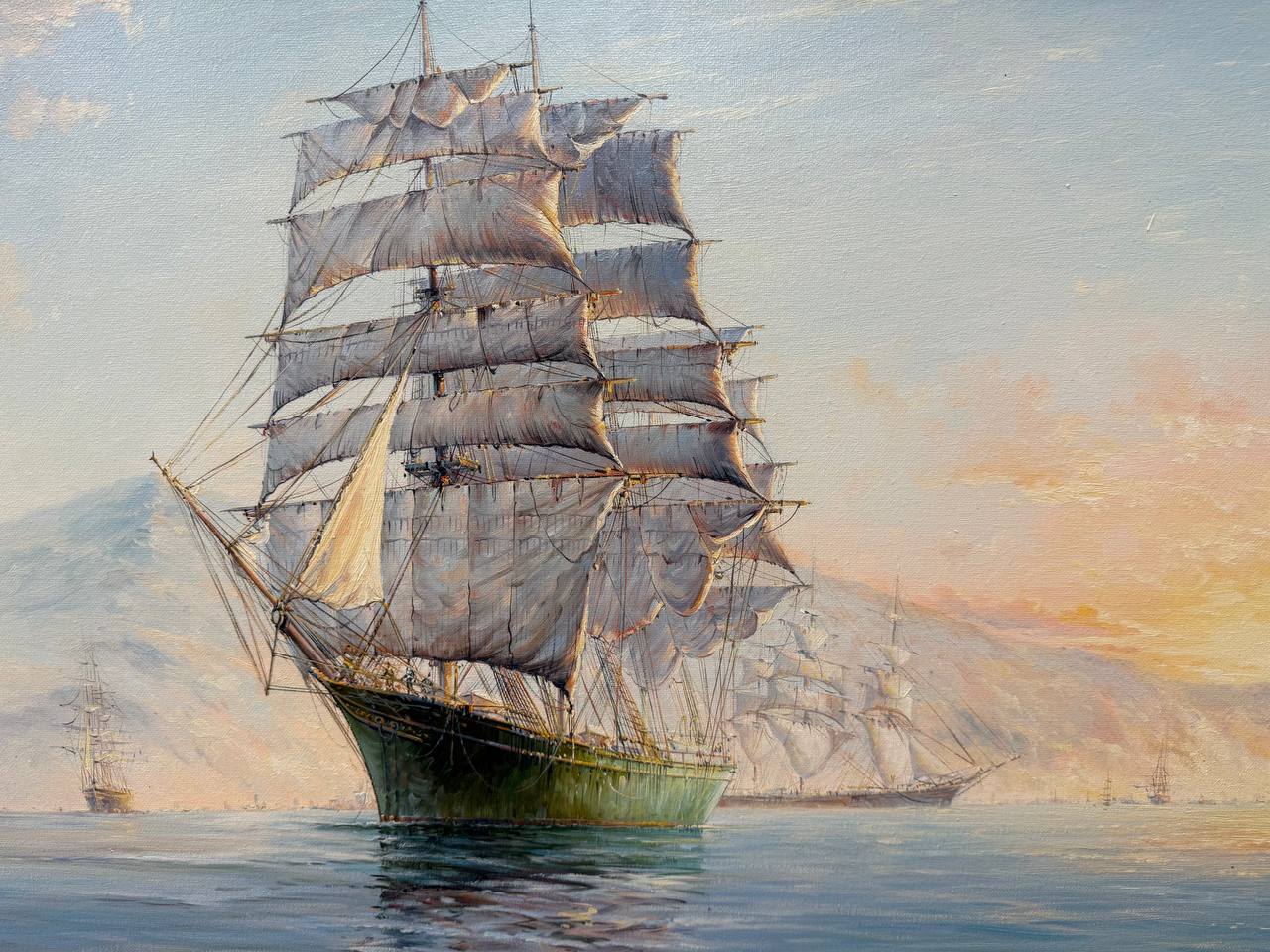 Белые паруса кораблей эффектно выделяются на фоне голубого неба и воды. Вдалеке видны горы, которые создают контраст с морской гладью и придают картине живописность.