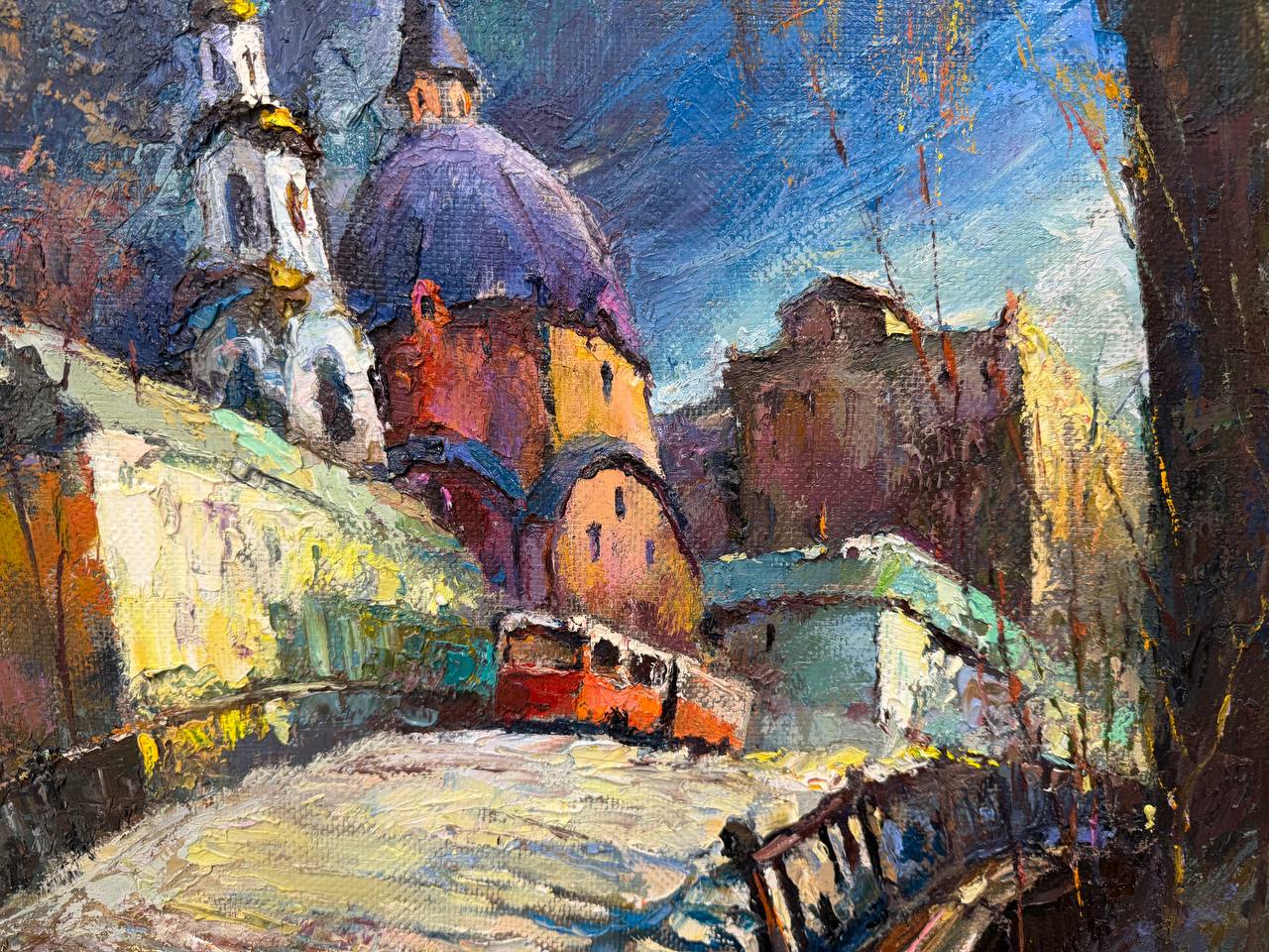 В целом, картина передает атмосферу уюта и спокойствия, сочетая в себе элементы природы, городской жизни и архитектурного наследия.
