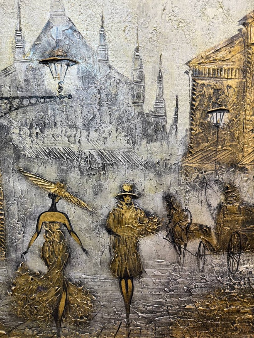 На этой черно-белой картине, украшенной золотыми деталями, изображен уютный городской пейзаж. На переднем плане две девушки, роскошно одетые в элегантные платья и стильные шляпки, идут по тротуару. Их наряды, возможно, декорированы кружевами и драгоценными деталями, что придает сцене атмосферу утонченности и века прошедшего.