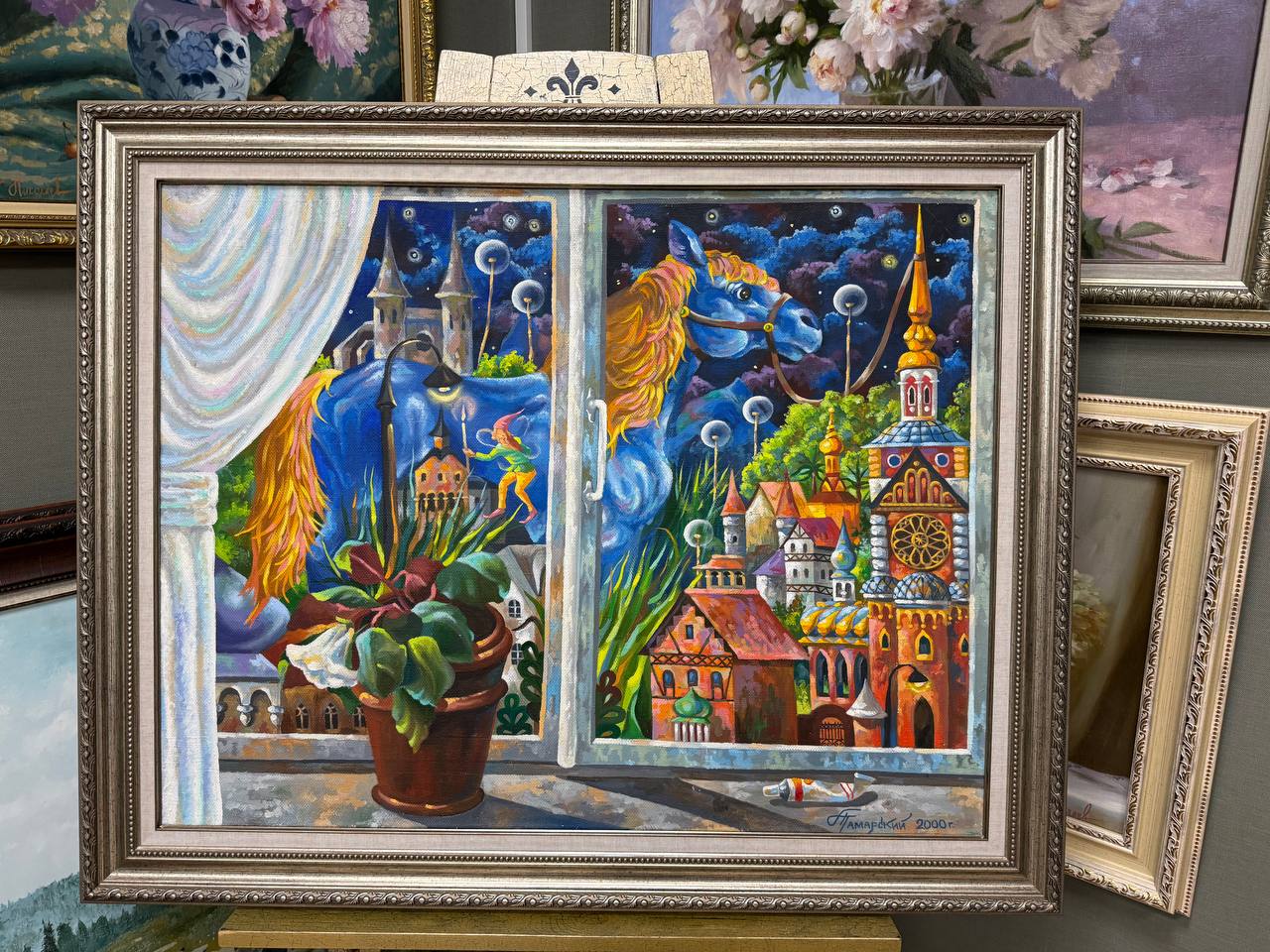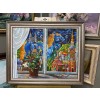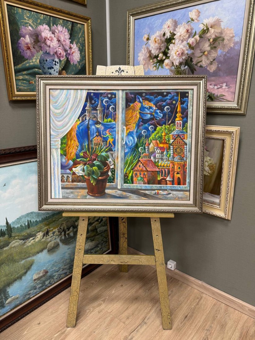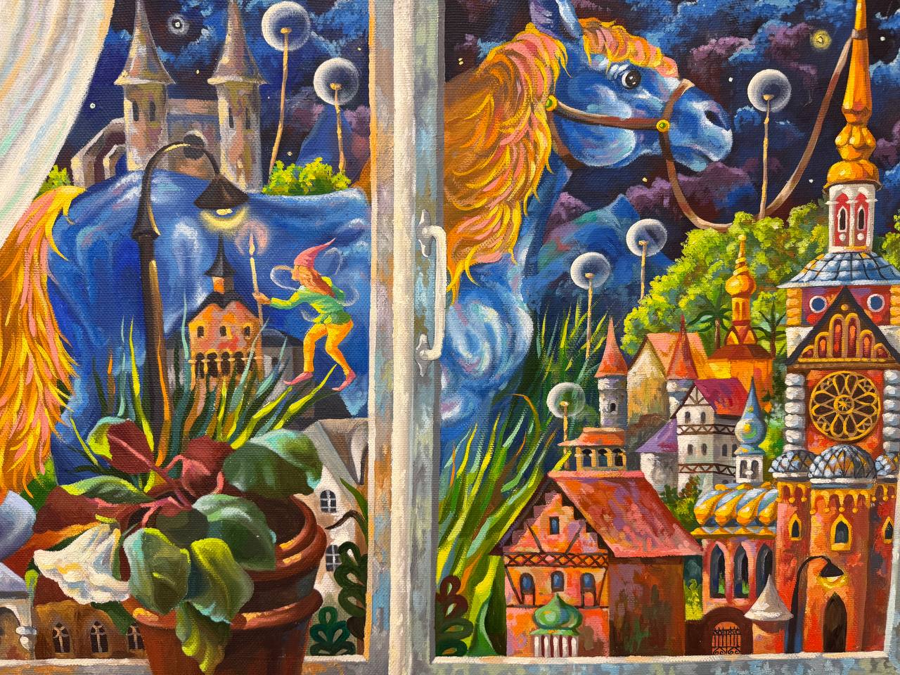 На картине изображена абстрактная сценка, которая сочетает в себе элементы реальности и сюрреализма. В центре внимания находится окно, через которое открывается захватывающий вид. Подоконник украшен горшком с цветами, их яркие лепестки контрастируют с холодными оттенками ночного неба. Рядом лежит тюбик с краской, из которого, кажется, только что выдавили яркий цвет, создавая ощущение, что художник только что закончил работу.