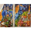 За окном виднеется синяя ночь, которая плавно движется среди причудливых замков, под звёздным небом. Замки имеют различные формы и размеры, некоторые из них напоминают сказочные конструкции, а другие — абстрактные, геометрические фигуры. Ночное небо темно-синее и усыпано звёздами, возможно, с легким намеком на галактики и космические объекты.