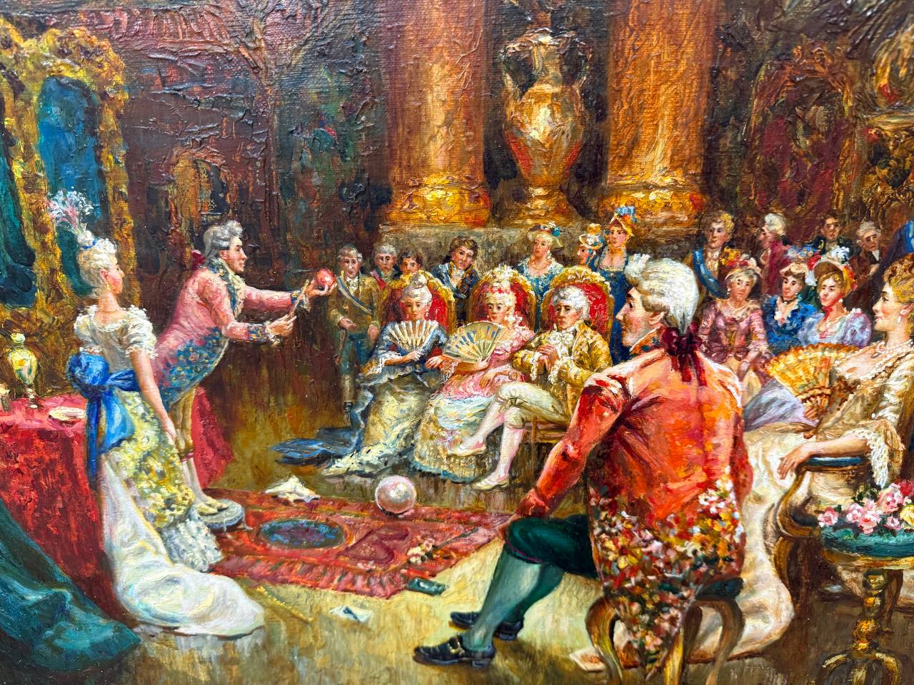 Картина написана маслом на холсте, картина с людьми "Выступление иллюзиониста".
