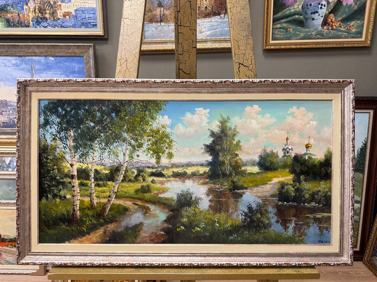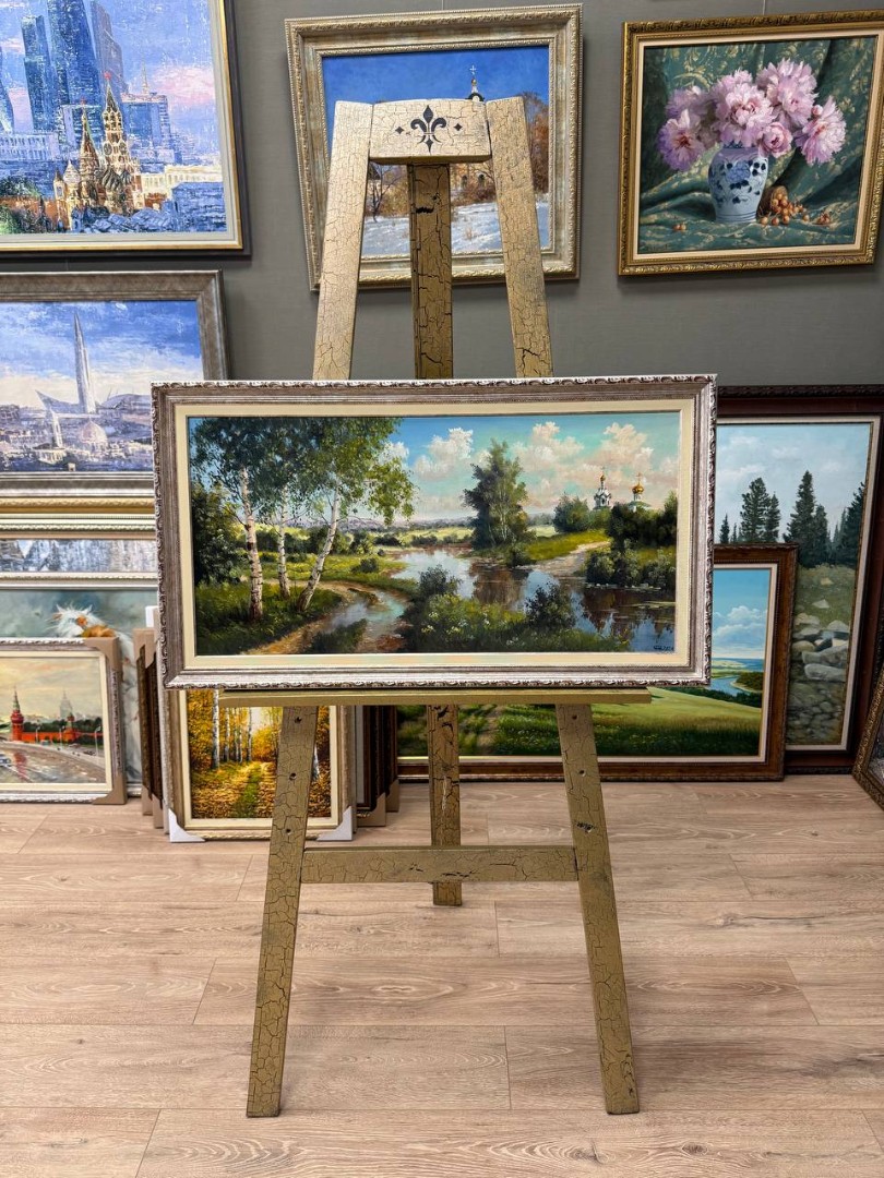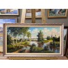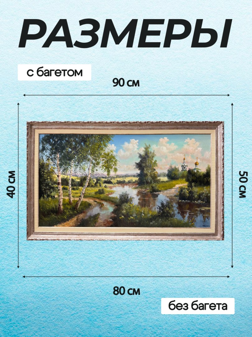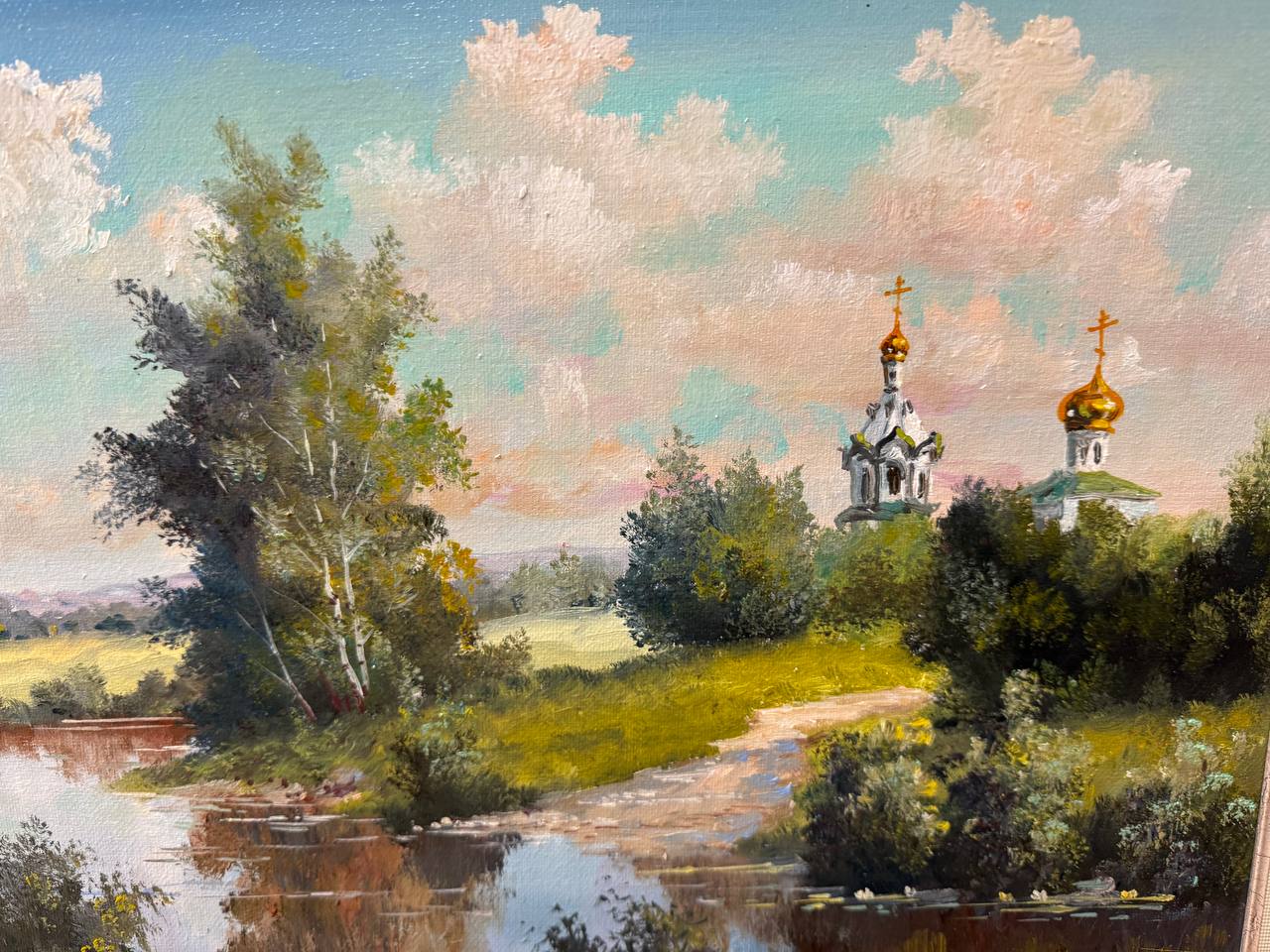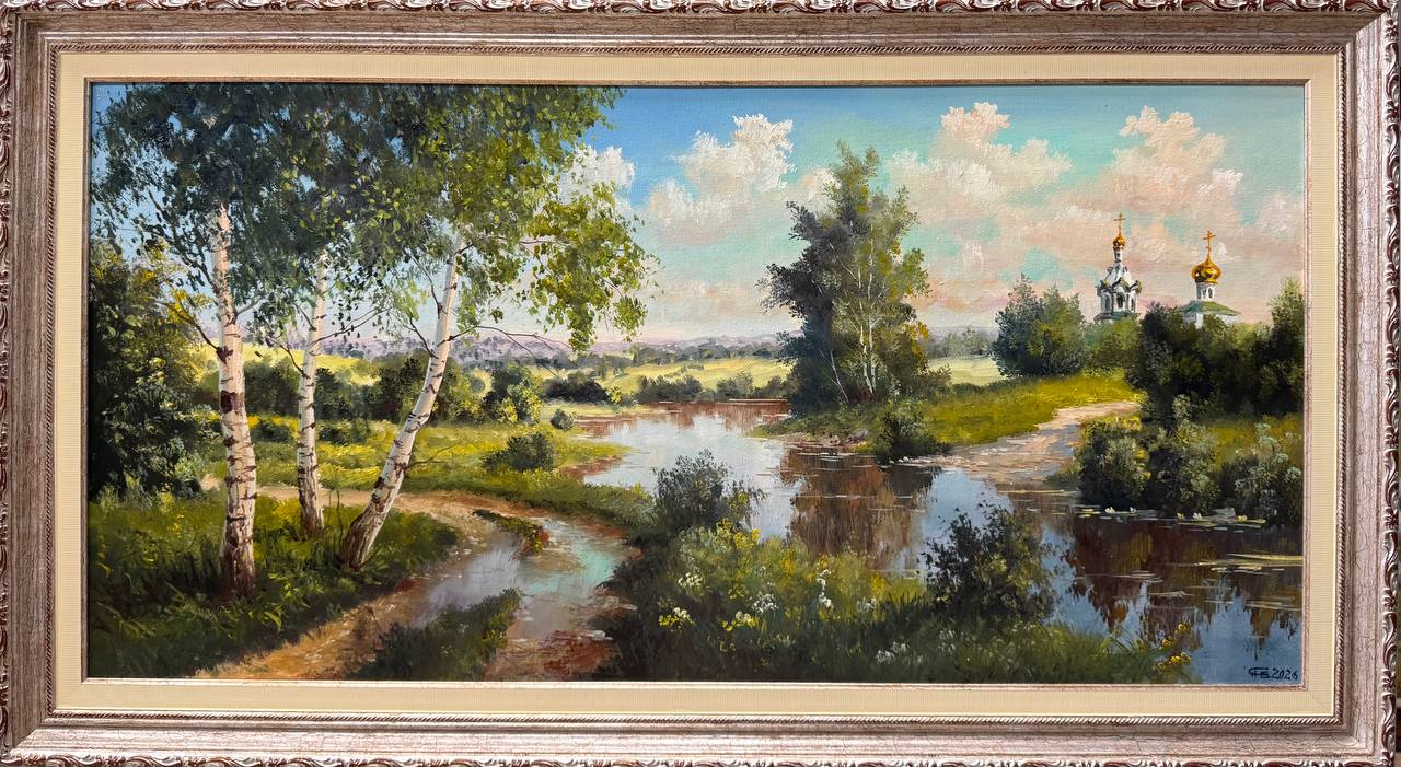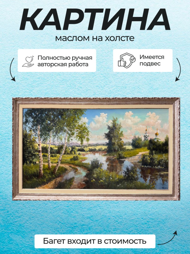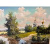 Картина написана маслом на холсте, летний пейзаж "Храм за рекой" 1.