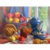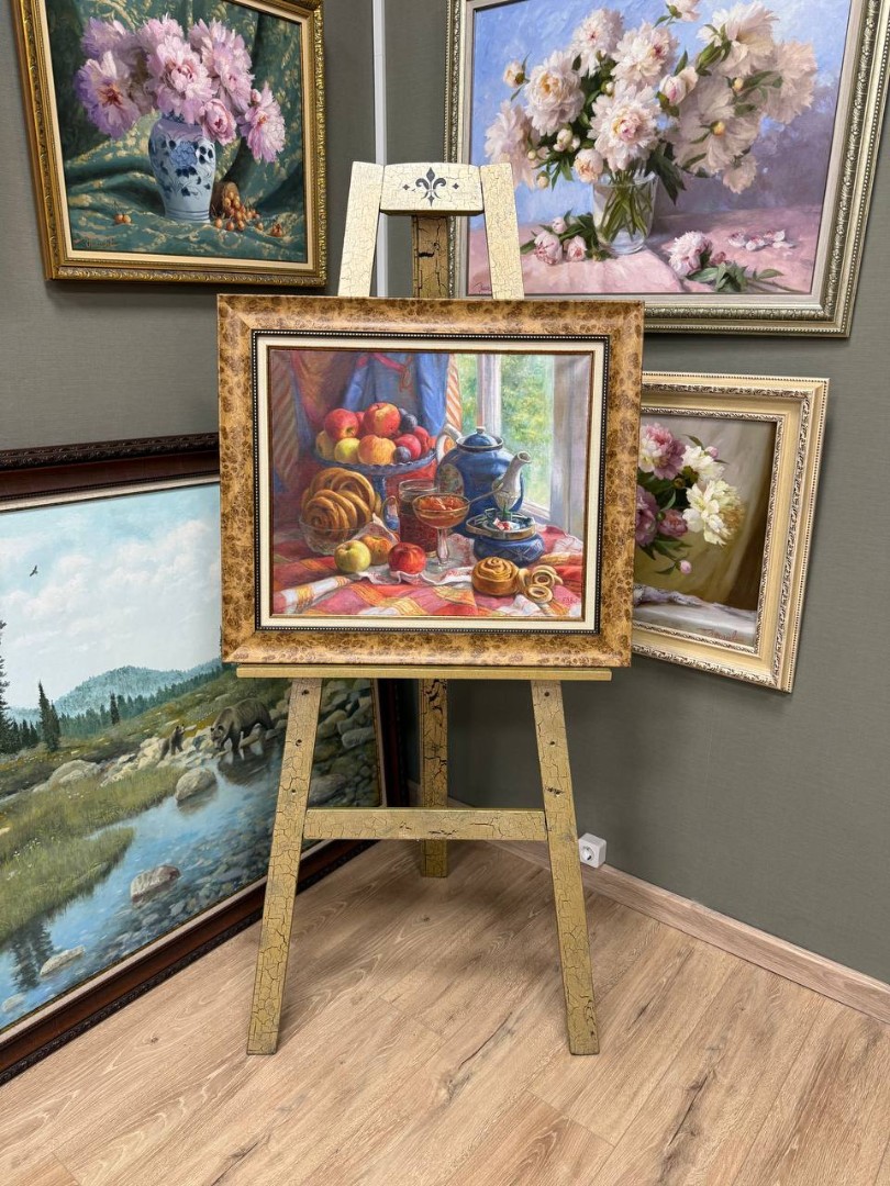 Свет, проникающий через окно, мягко освещает все предметы, придавая им лёгкий, чуть теплый оттенок и создавая ощущение спокойствия и уюта. В целом, натюрморт передает атмосферу домашнего тепла и радушия, приглашая зрителя насладиться моментом и погрузиться в эту мирную обстановку.