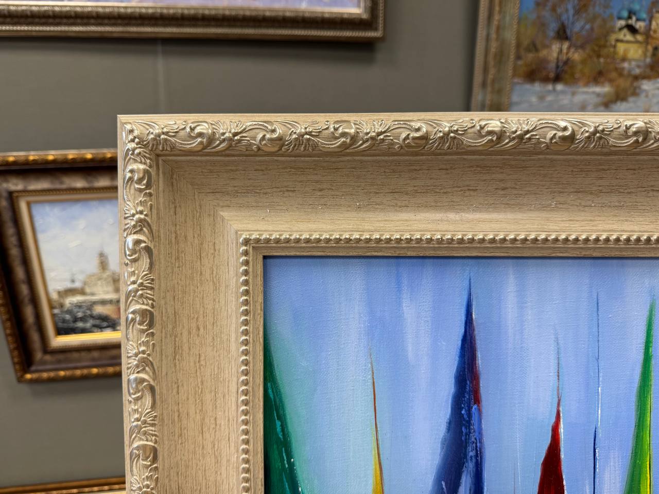 На картине изображены абстрактные яхты разных цветов на синем фоне. Яркие краски яхт создают ощущение праздника и динамики. Они как будто плывут по волнам, создавая причудливые формы и линии.