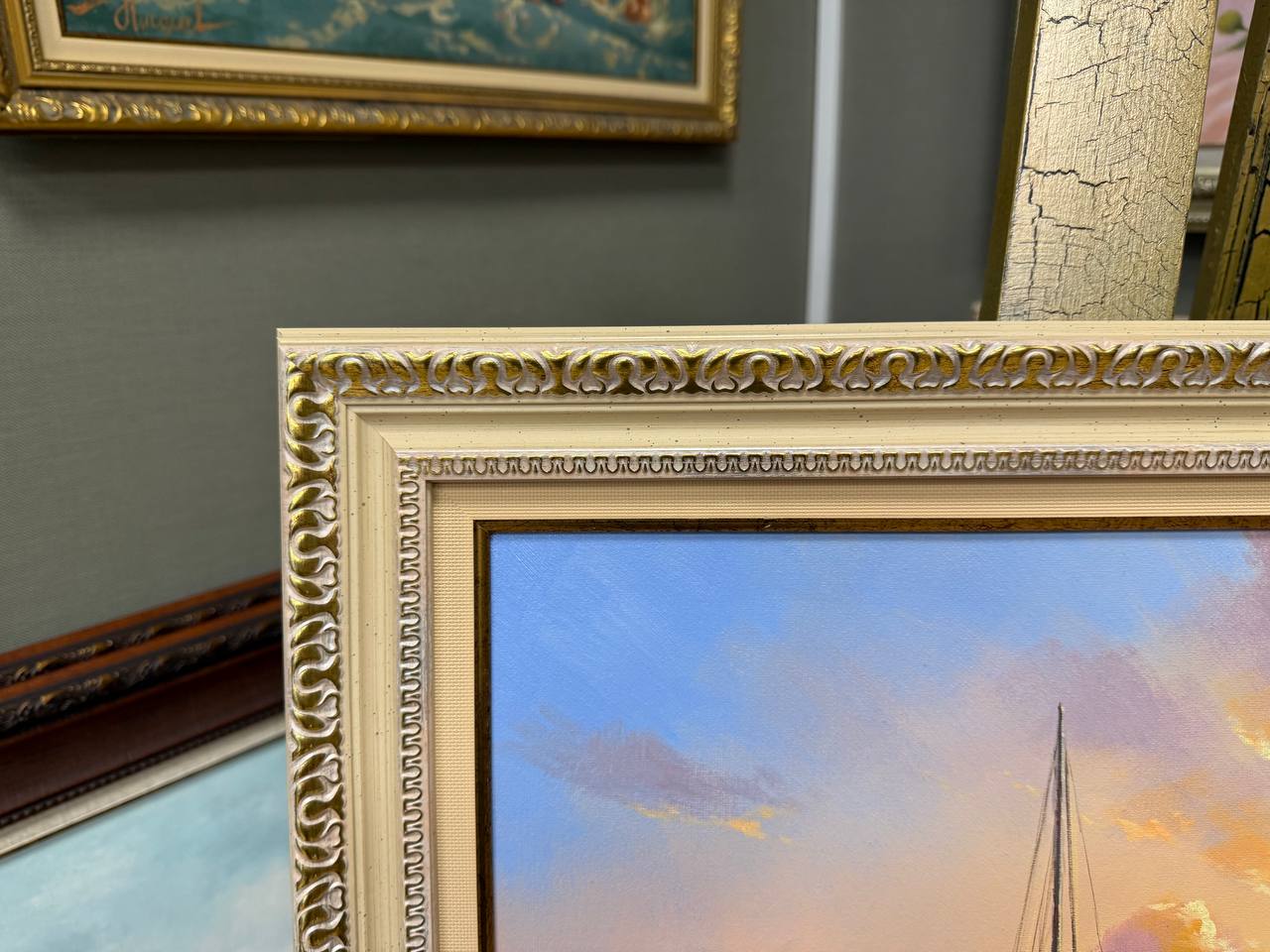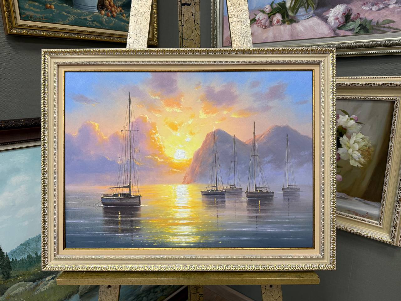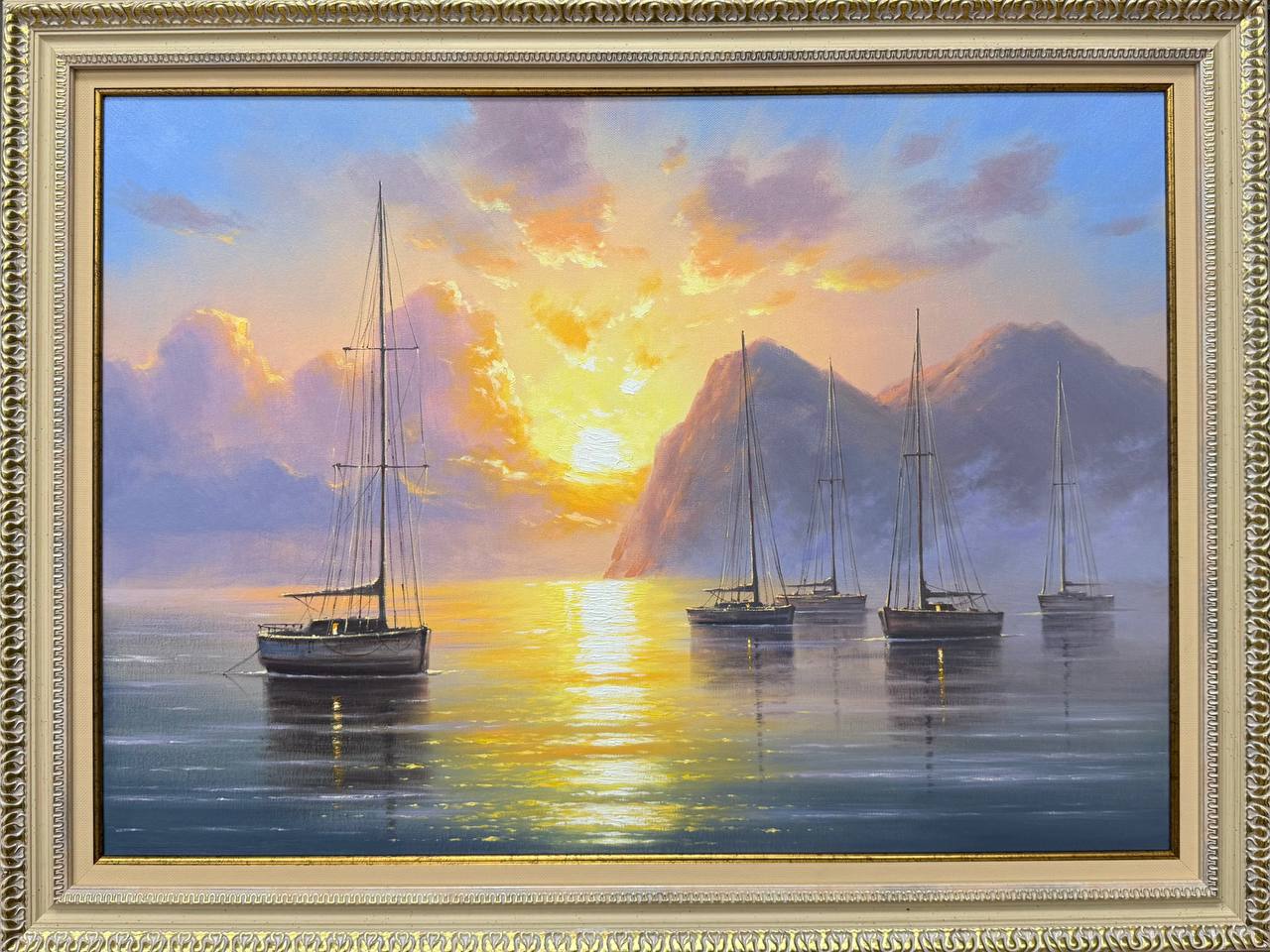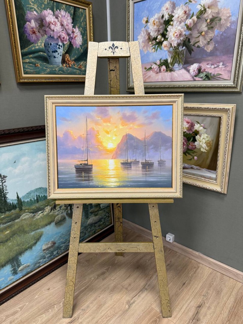 На картине изображены яхты, мирно покачивающиеся на спокойных водах моря. Штиль окутал атмосферу, и поверхность воды напоминает гладкое, как зеркало, полотно. Паруса яхт спущены, не нарушая тишины и гармонии окружающего мира. Легкий морской бриз едва касается кожи, создавая ощущение легкости и спокойствия.