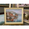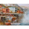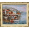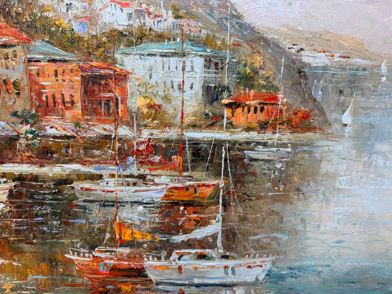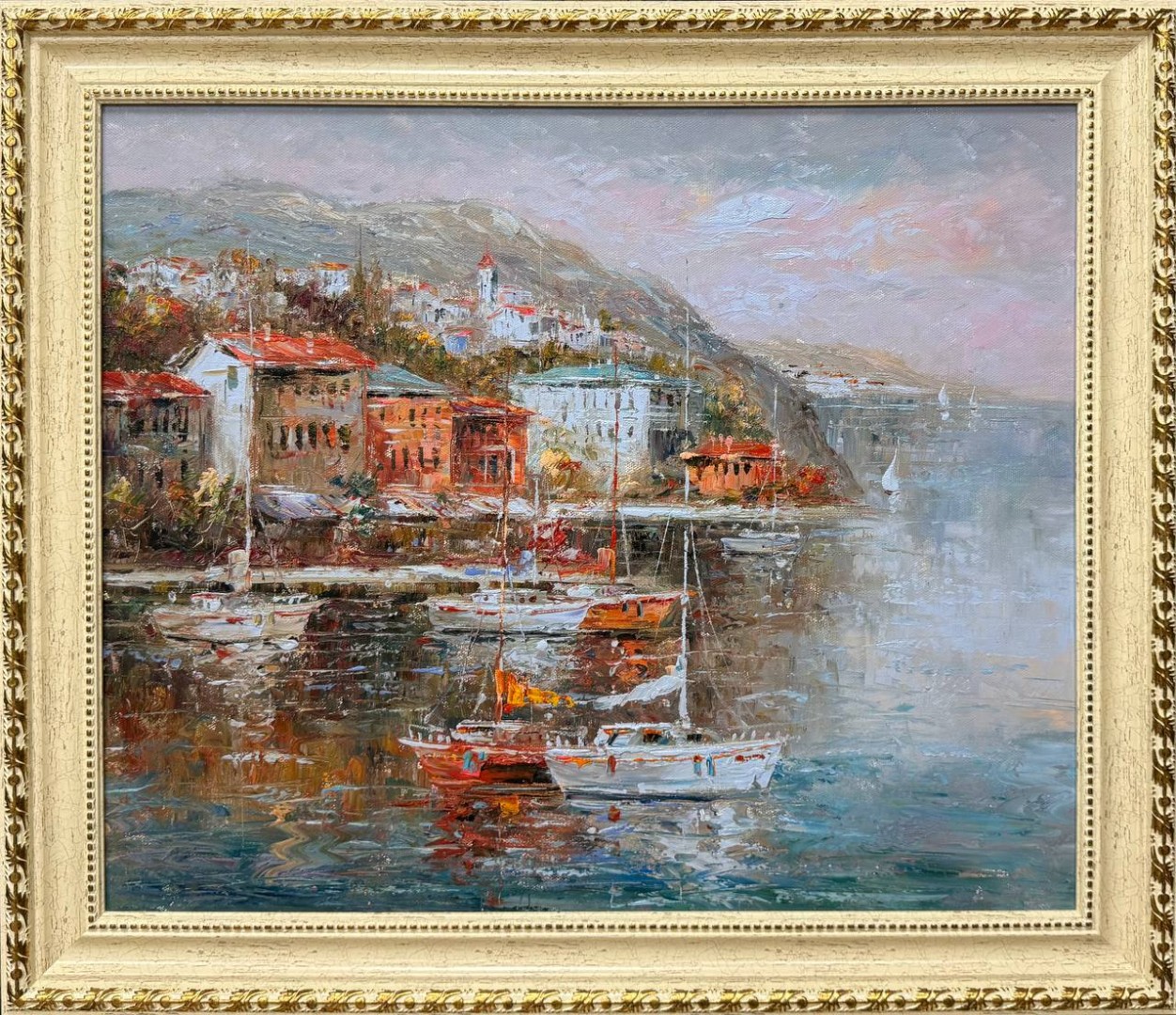 На картине изображено спокойное море, у которого берег аккуратно обрамлен маленькими уютными домиками с яркими крышами. Эти домики, словно выставленные на витрине, создают атмосферу уюта и спокойствия. В центре композиции плавно расположились яхты, паруса спущены, что придает сцене ощущение покоя и расслабленности.