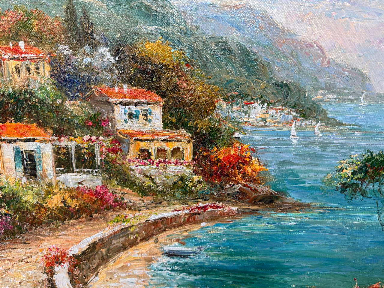 На картине изображён живописный южный городок, залитый ярким солнечным светом. Лето в полном разгаре, и это прекрасно ощущается в атмосфере. Нежные, золотистые лучи солнца играют на поверхности моря, которое сверкает синими и изумрудными оттенками. Вода покачивается на волнах, создавая ощущение спокойствия и безмятежности.