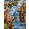 На картине изображено живописное море, которое стремительно накатывает на величественные скалы. Их острые формы контрастируют с мягкими волнами, создавая динамику и настроение. На переднем плане можно увидеть несколько замков, которые расположены как бы на границе между реальностью и фантазией. Эти замки выглядят величественно и таинственно, с высокими башнями и витиеватыми балконами, словно охраняют секреты прошлого.