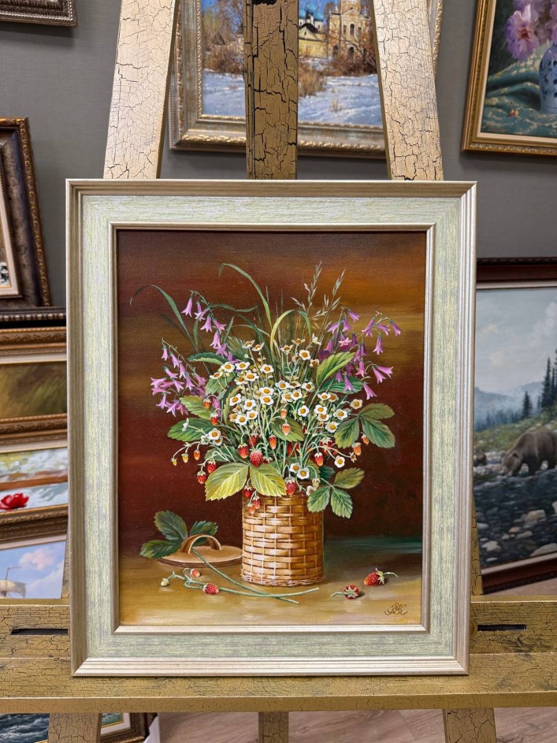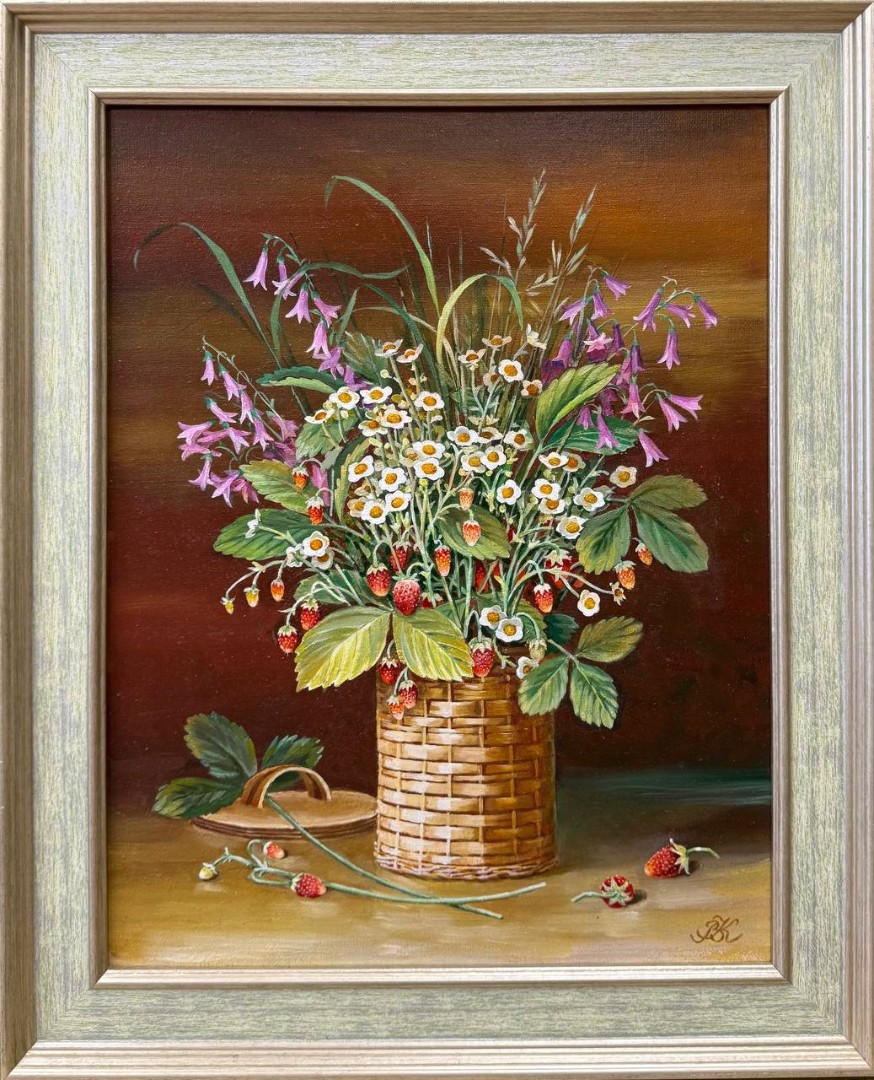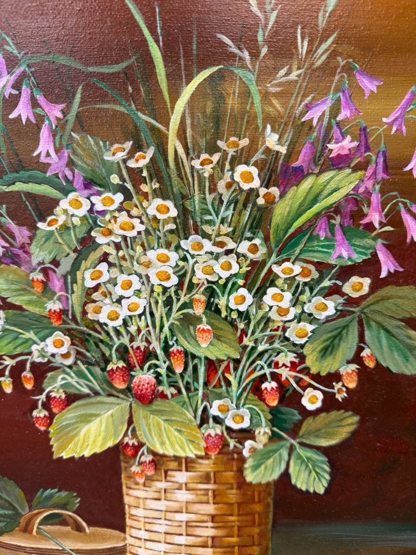 Картина написана маслом на холсте, цветы "Земляника в корзине".