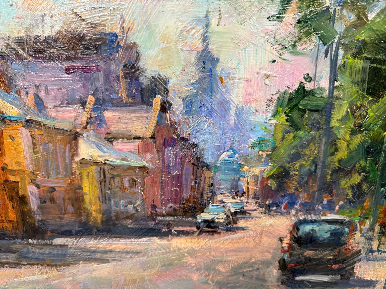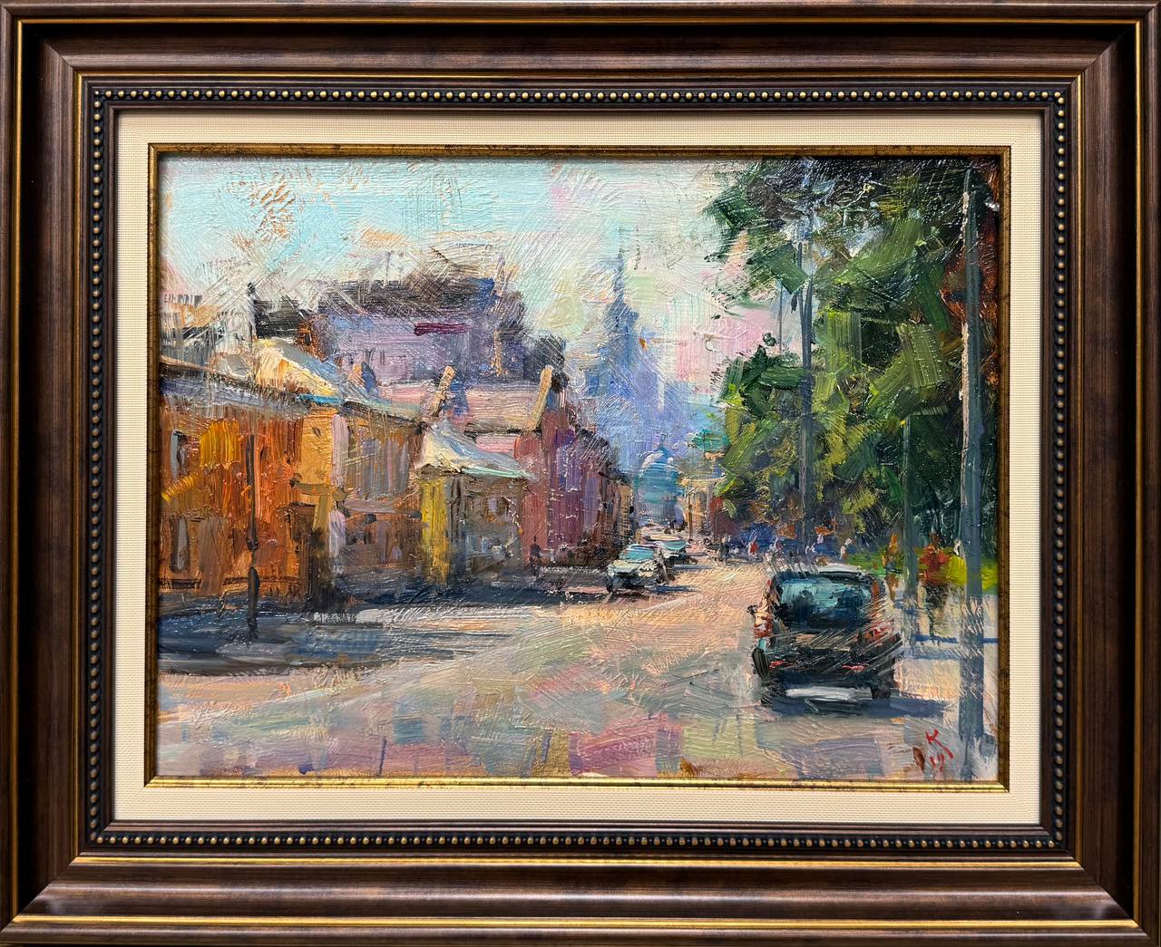 На картине изображен жаркий вечер в городе. Путешествие по пустынной улице, где нет людей, создает атмосферу уединения и покоя. Асфальт, прогретый солнцем, светится теплыми оттенками, а в воздухе висит легкая пыльца и аромат горячих камней.