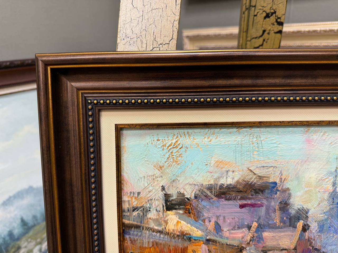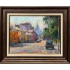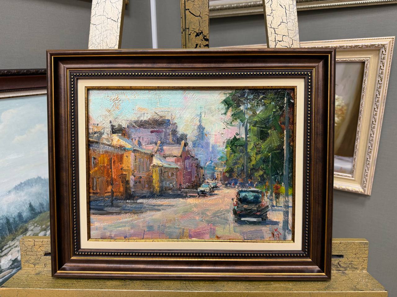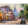 Картина написана маслом на мдф, городской пейзаж "Жаркий вечер".