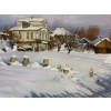 На картине изображена спокойная и умиротворяющая сцена. В центре внимания – маленькая деревня, окутанная снежным покровом. Высокие сугробы вдоль тропинок и у дверей домов создают ощущение настоящей зимней сказки.