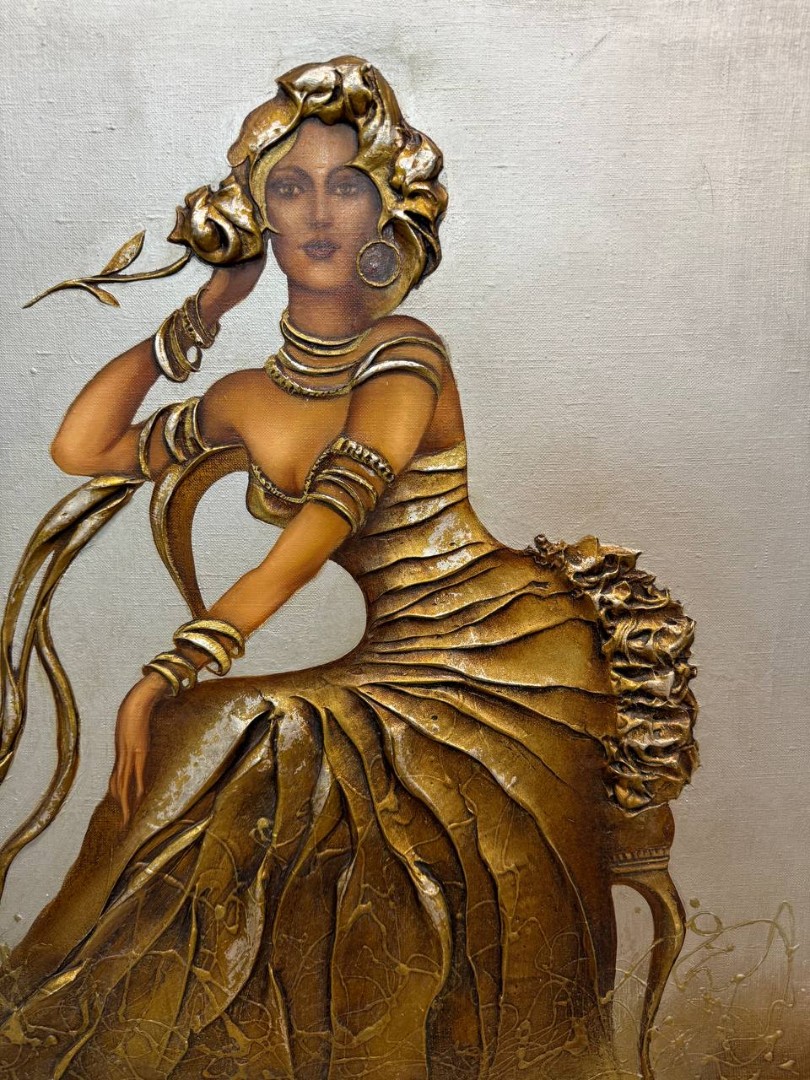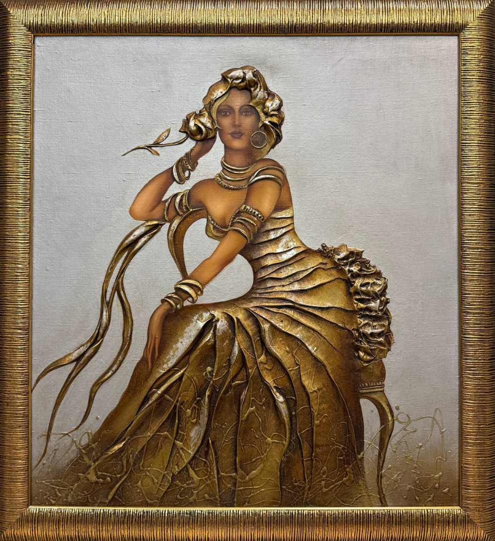 На картине изображена девушка, одетая в великолепное золотое платье, которое блестит и переливается на свету, словно соткано из солнечных лучей. Платье обвивает её фигуру, подчеркивая грацию и изящество. Девушка сидит в расслабленной позе, её золотистые волосы струятся по плечам, словно водопад из драгоценных металлов, создавая ощущение лёгкости и воздушности.