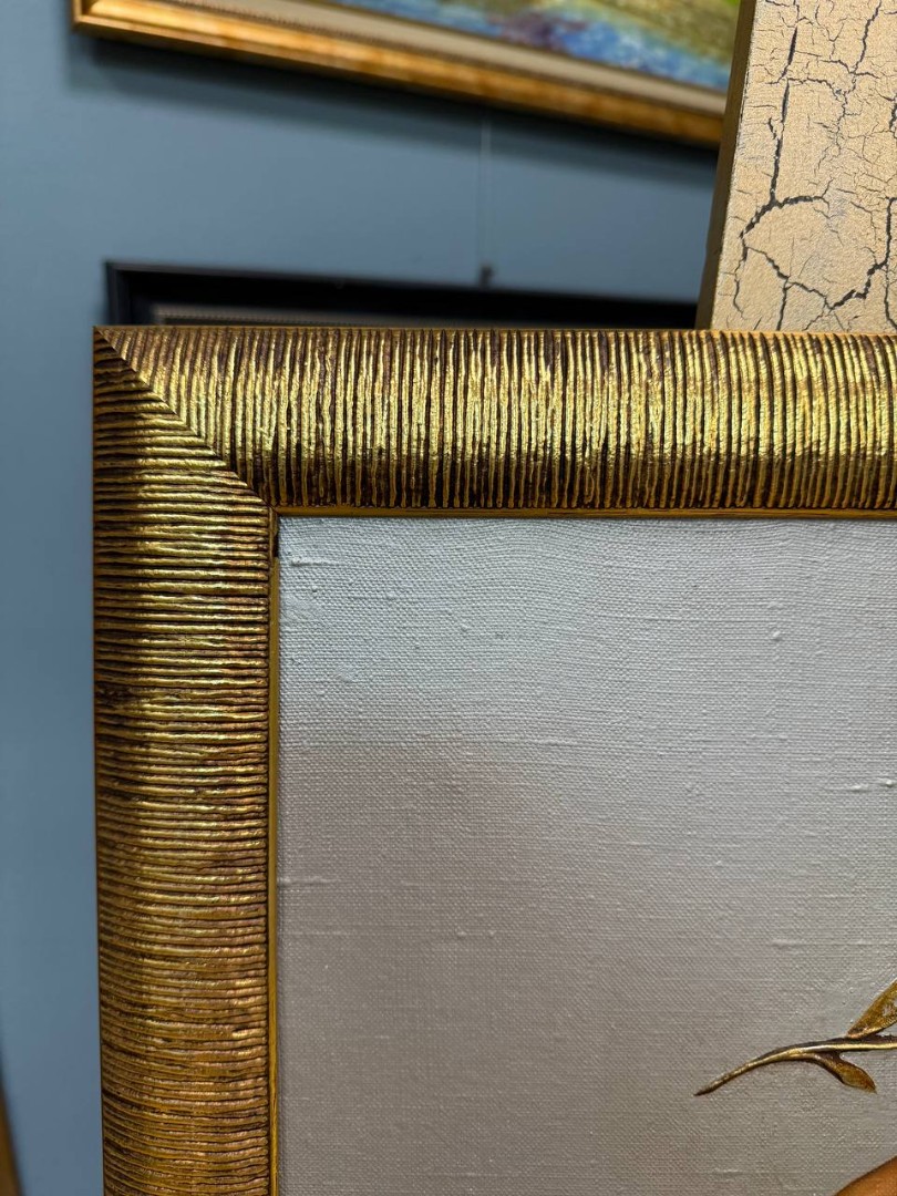 Фон картины выполнен в мягких, тёплых тонах, которые гармонируют с золотыми оттенками, подчеркивающих основное изображение.